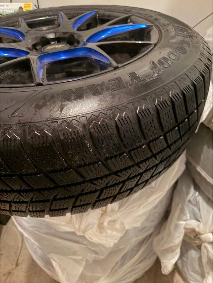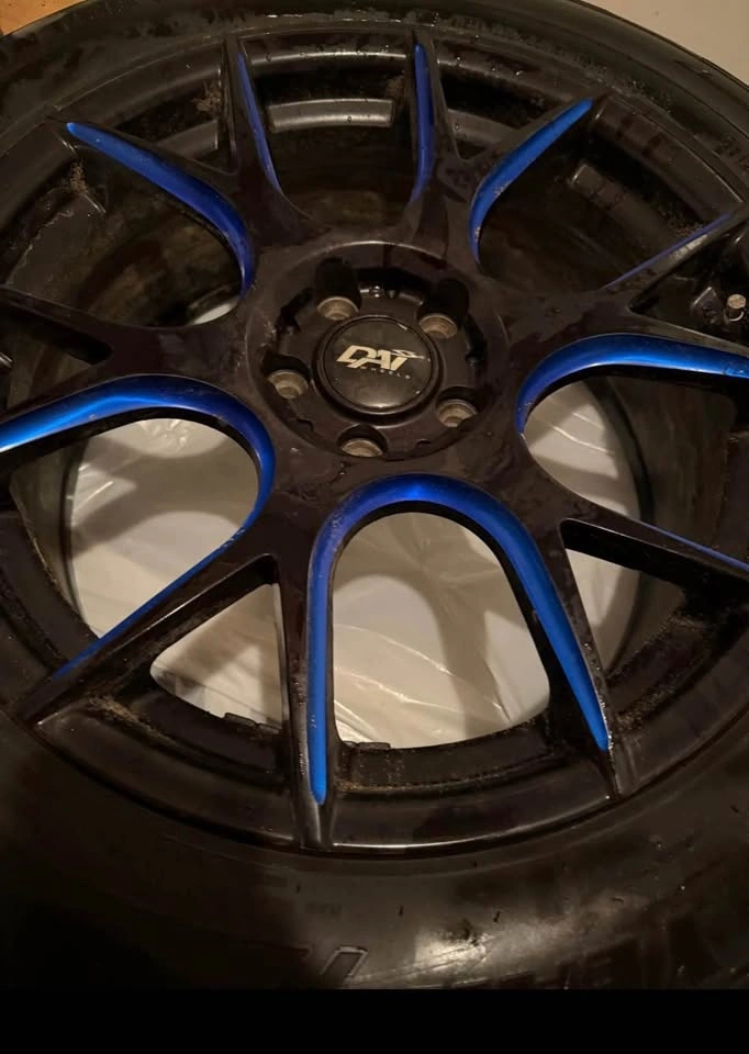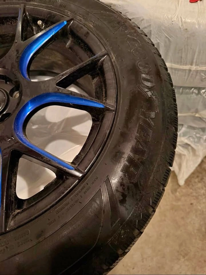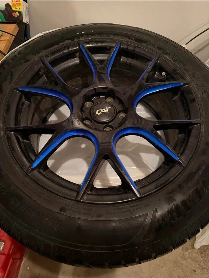 Set of 4 winter tires already mounted on stylish aftermarket rims. Rims are blue and black and look great installed. Tires have good tread remaining and were used only for winter driving.