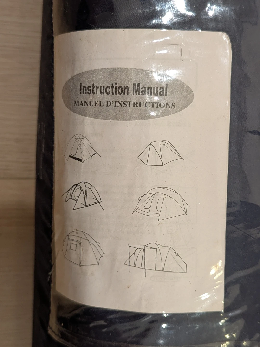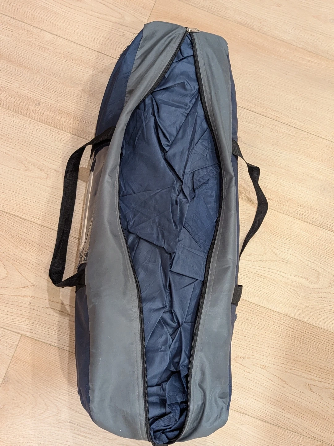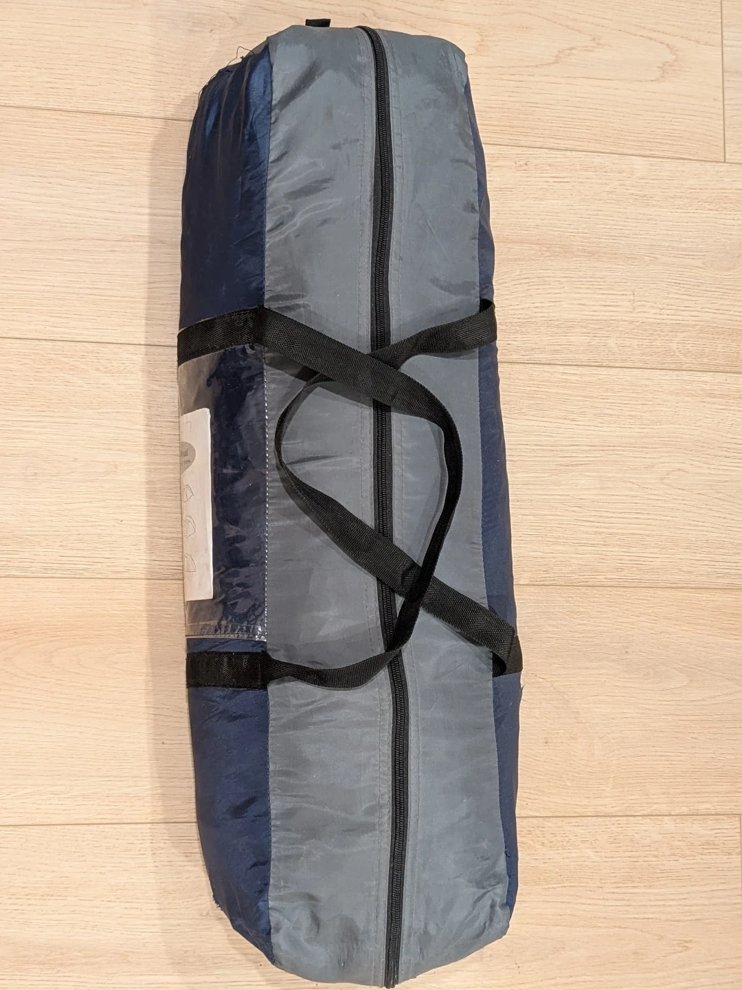This is a 2-person tent plus carry bag. It's made of durable nylon material in blue and grey. The bag has two handles and a zipper closure. Includes an instruction manual.