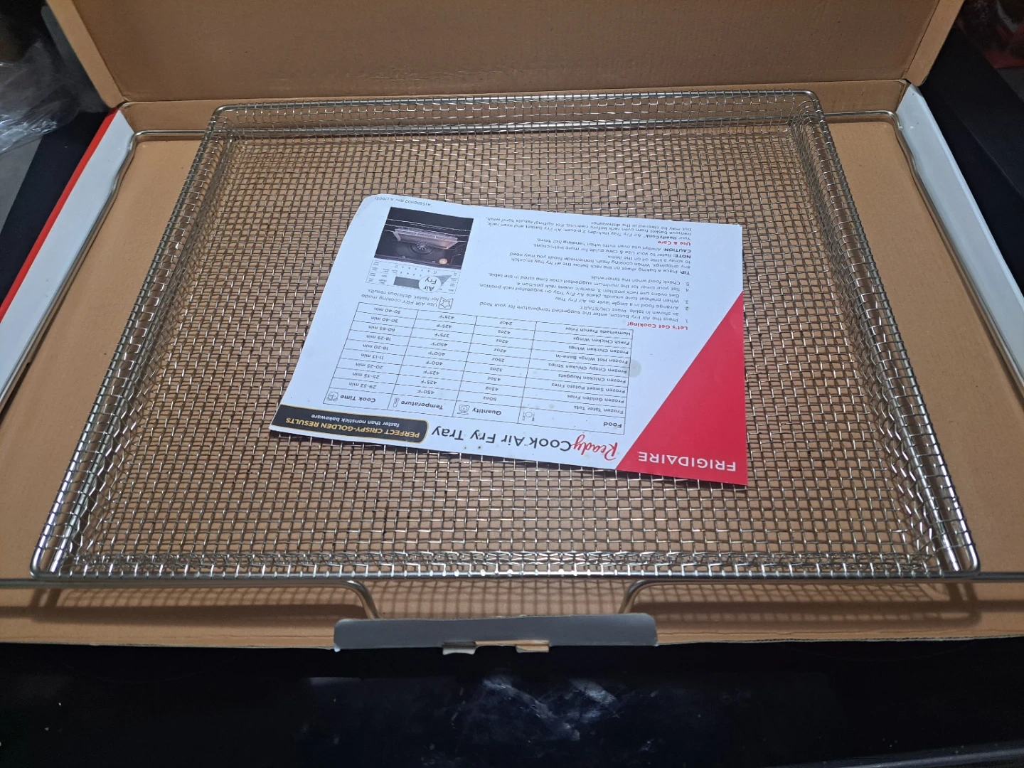 Frigidaire Ready Cook Stainless Steel Air Fry Tray. Includes oven rack and air fry basket. Dimensions are 24.1" x 15.3" x 0.8" and 18.4" x 15.3" x 0.8".