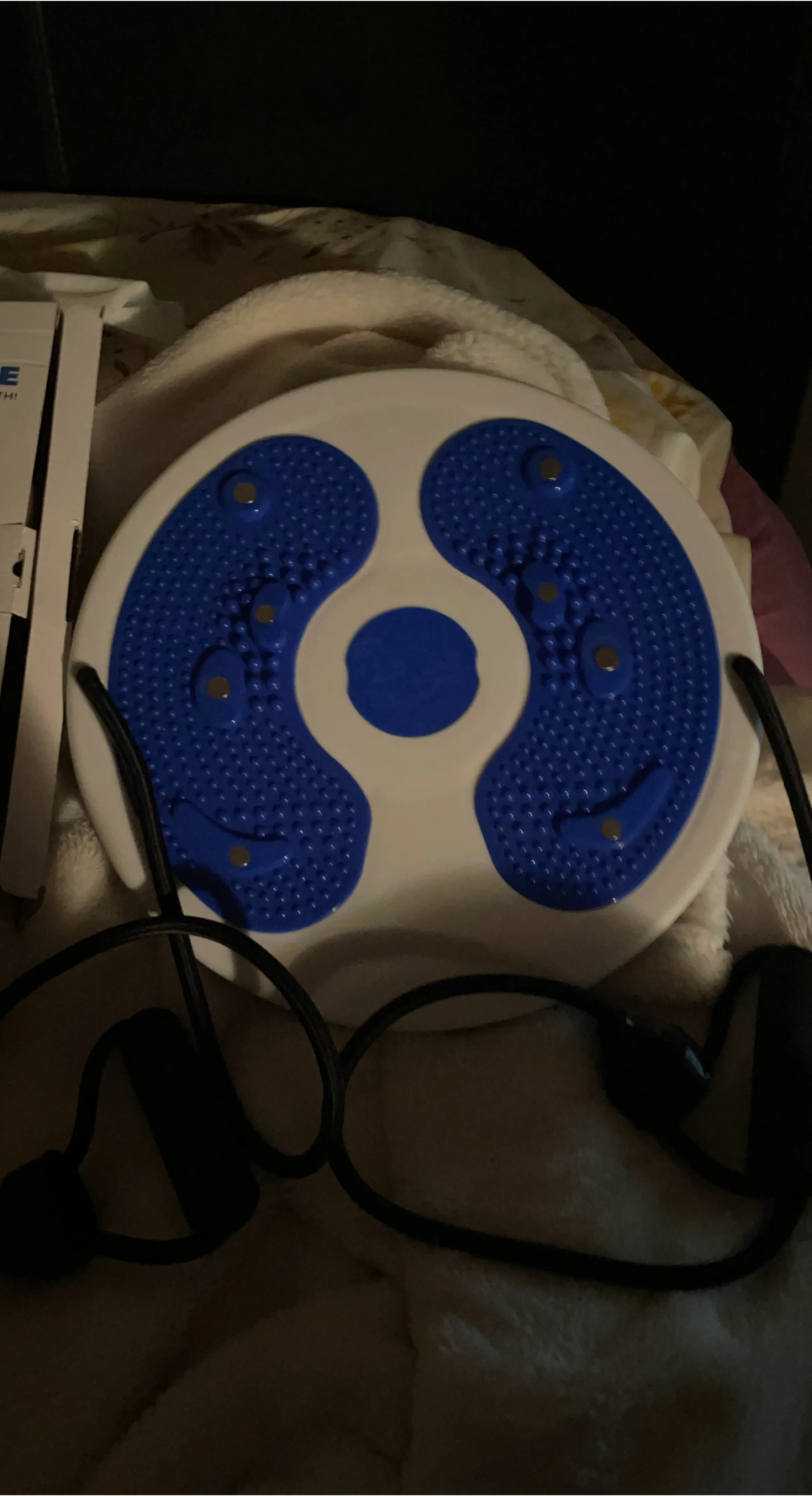 This is a twisting waist exercise disc. It features a blue textured surface with massage points and includes resistance bands for a full-body workout. Great for improving core strength!