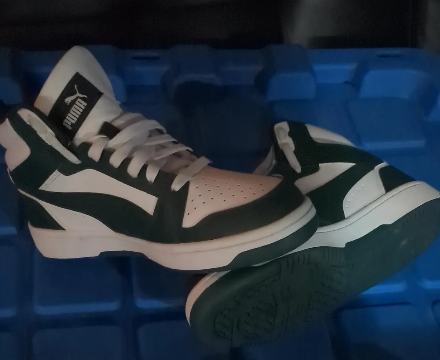 These are Puma high-top sneakers in white and green. They have a classic lace-up closure and are made with a combination of leather and synthetic materials. Good for casual wear.