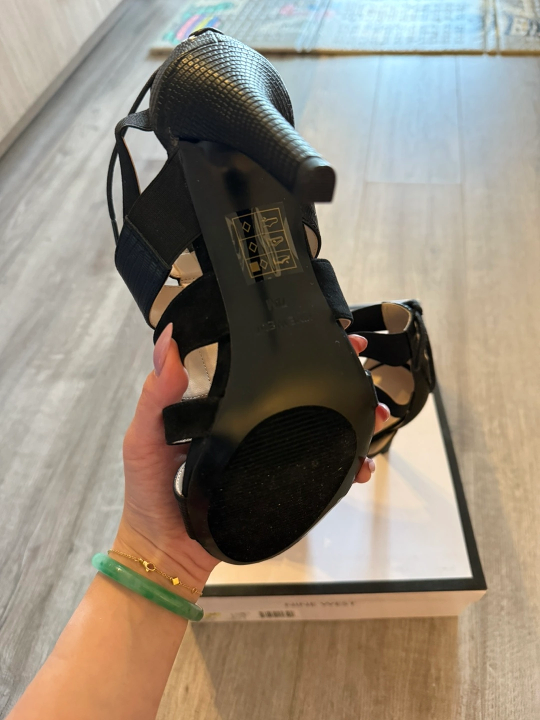 These Nine West heels feature a black strappy design with textured accents. They come in a size 7.5M. The original box is included. Only worn these inside the house. Pick up by the Eaton Center. $5 brand new
