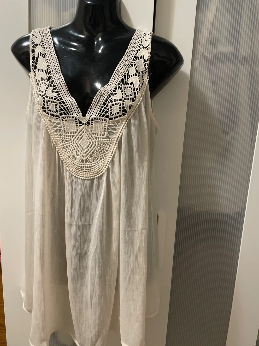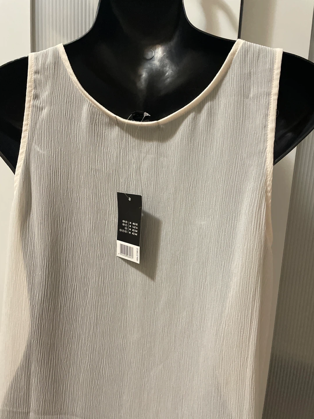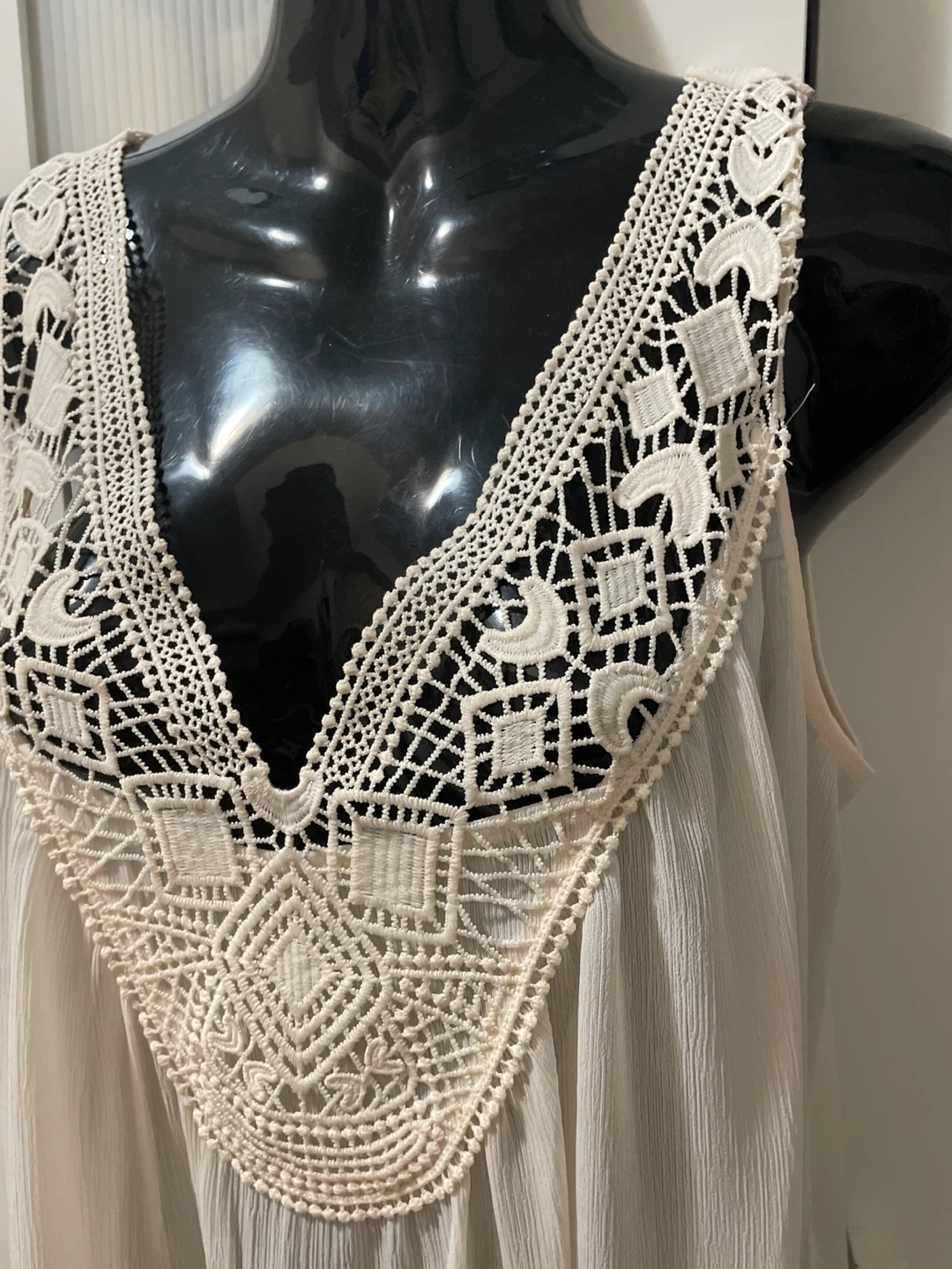 This is a women's sleeveless tank top from Esmara in a cream colour. It features a V-neckline with intricate crochet detailing. The fabric has a slightly crinkled texture. Size is M.