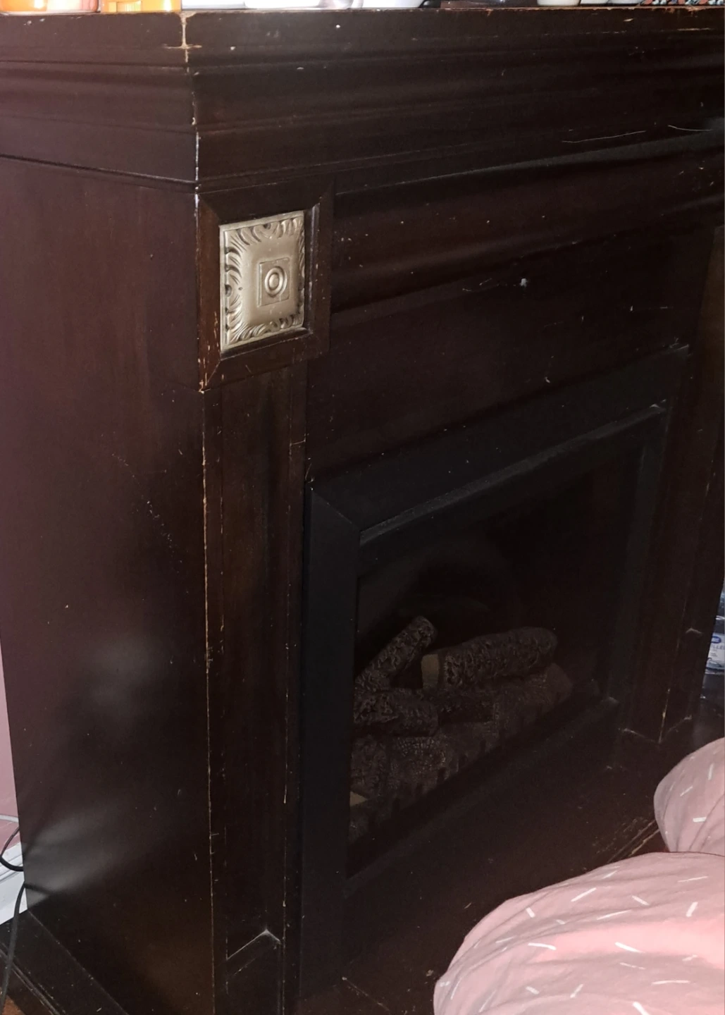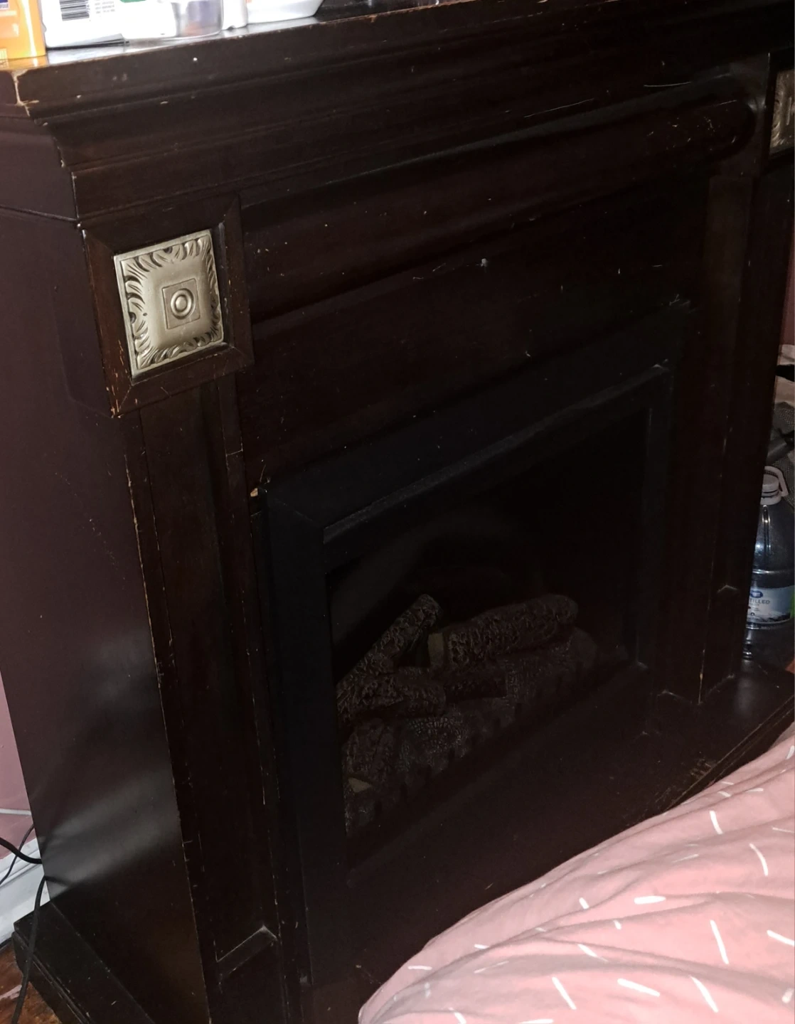 This is an electric fireplace unit with a dark brown finish. It has a decorative mantelpiece and a realistic-looking log set inside. It's a nice addition for a cozy room. Measures 30" wide x 36" high x 12" deep.