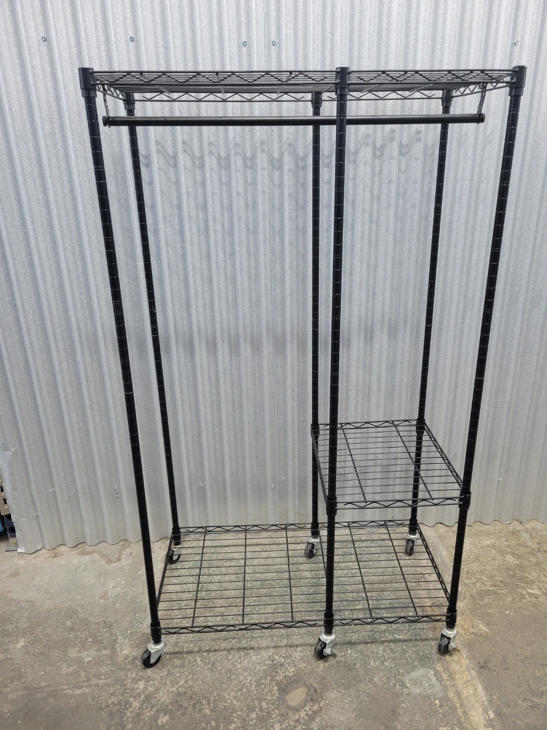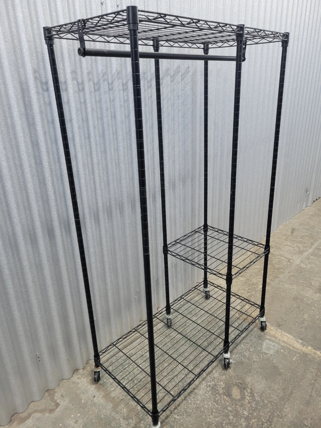 This black metal wire garment rack features a sturdy construction with multiple shelves for storage and a hanging rod for clothes. It's on wheels for easy mobility. Assembly hardware is included.