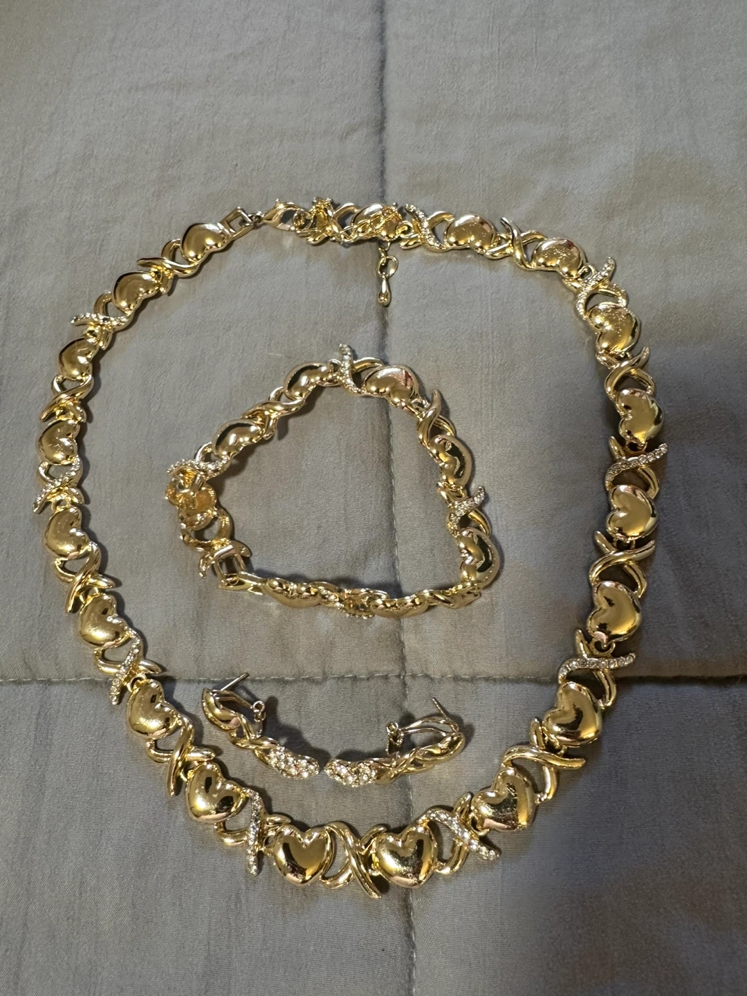 This is a gold tone jewelry set featuring a necklace, bracelet, and earrings. The design includes "XOXO" links with heart accents and small clear stones. It's a matching set perfect for everyday wear or special occasions! Pick up East 106th and 1st ave!