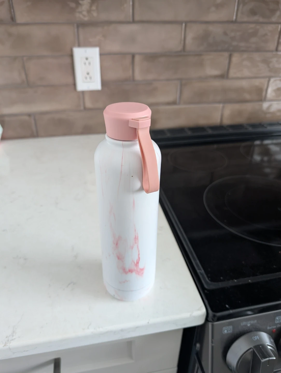 Two stainless steel water bottles are available. One is blue with a flip-top lid and carry handle. The other has a white and pink marble design with a screw-top lid and a loop. Both are good for staying hydrated on the go! Both will be cleaned again before selling