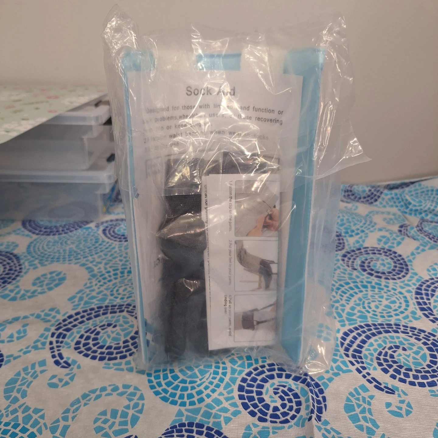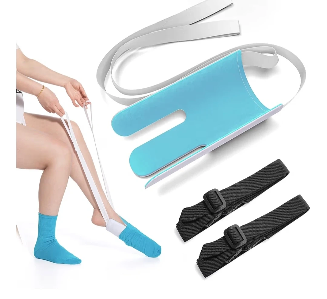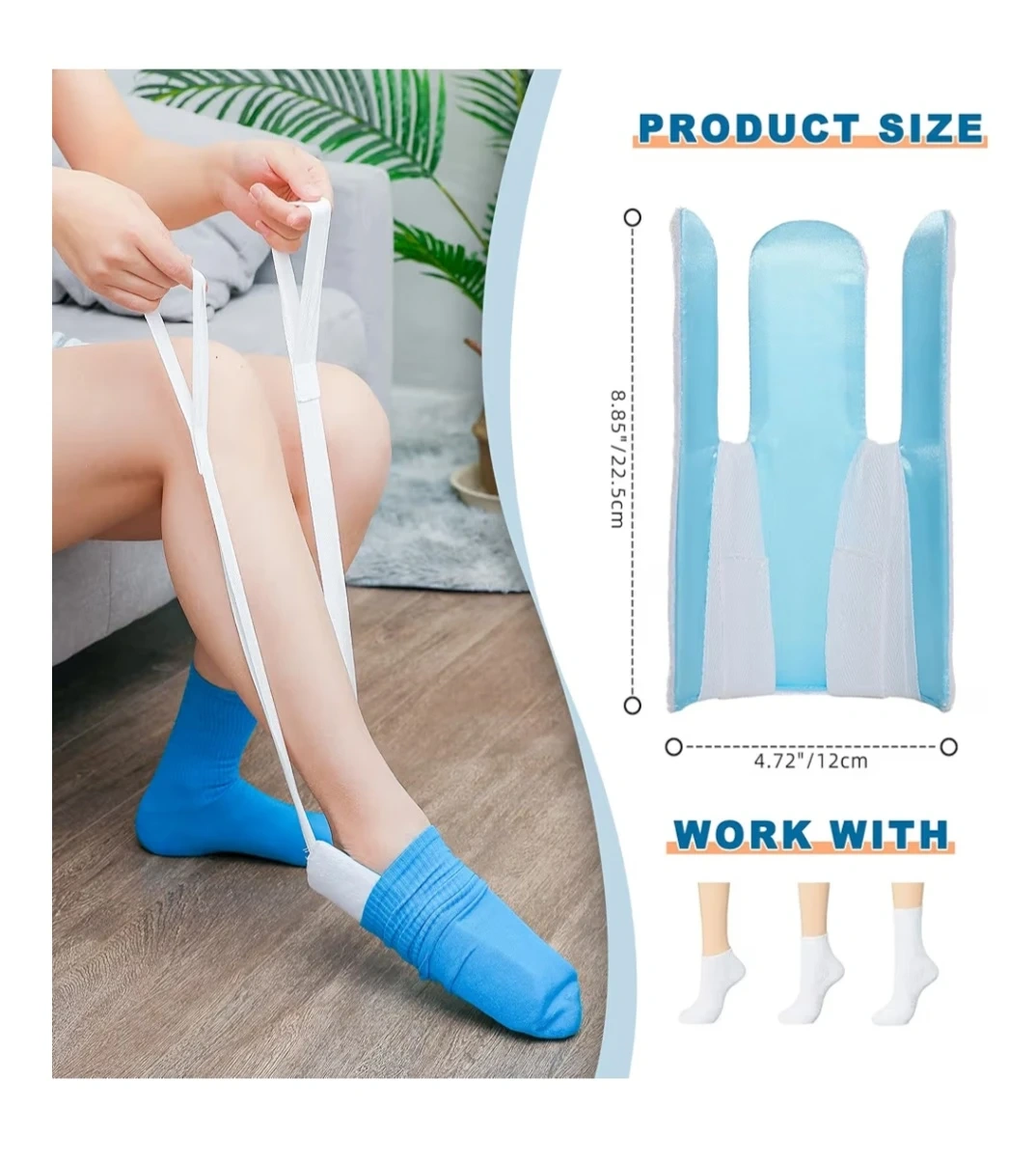This sock aid device is designed to help you easily put on socks. It's helpful for those with limited mobility or recovering from injury. The package also includes pants assist straps for added convenience.