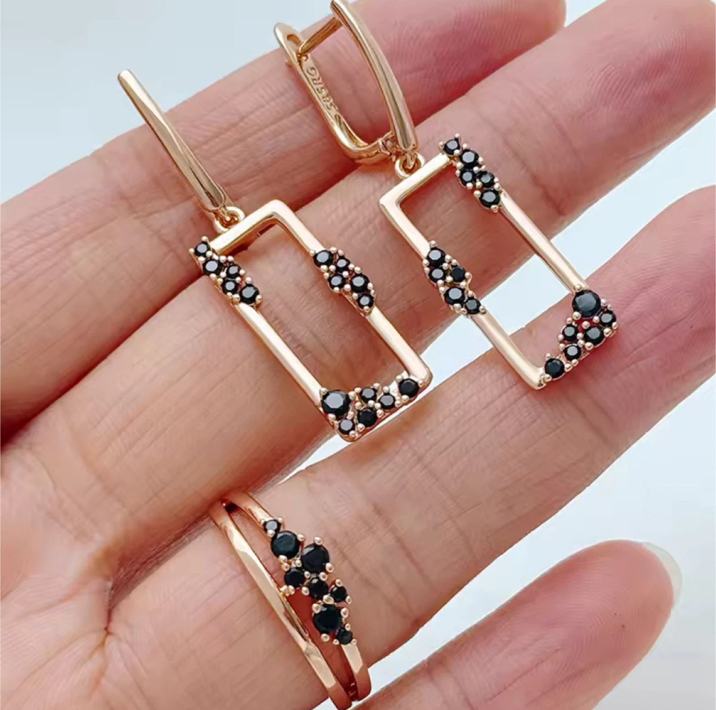 This is a jewellery set featuring rose gold tone rectangular earrings and a matching ring. Both pieces are adorned with small black zircons. Price includes all pieces .