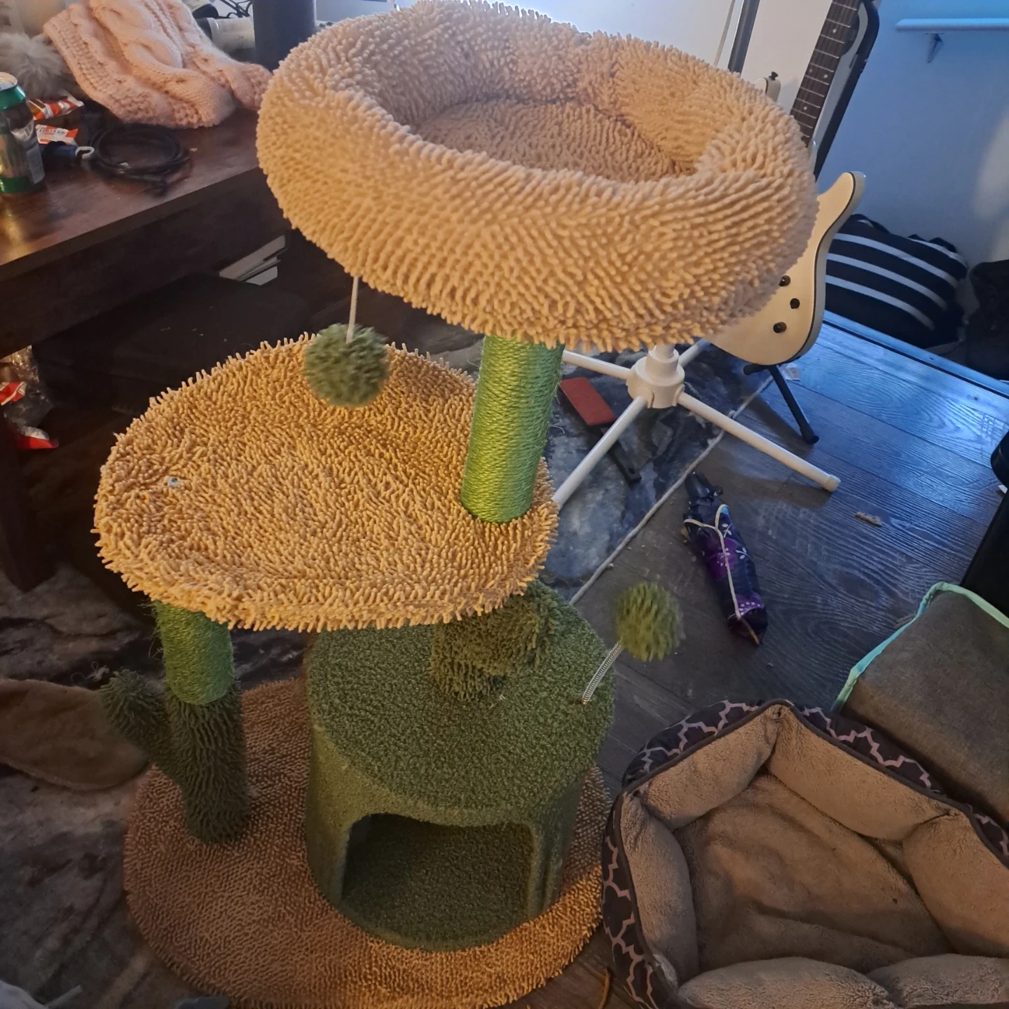 This cat tree features multiple levels for lounging and playing. It has sisal rope scratching posts for claw maintenance and cozy condos for napping. Your feline friend's new favourite spot! Not suitable for big cats