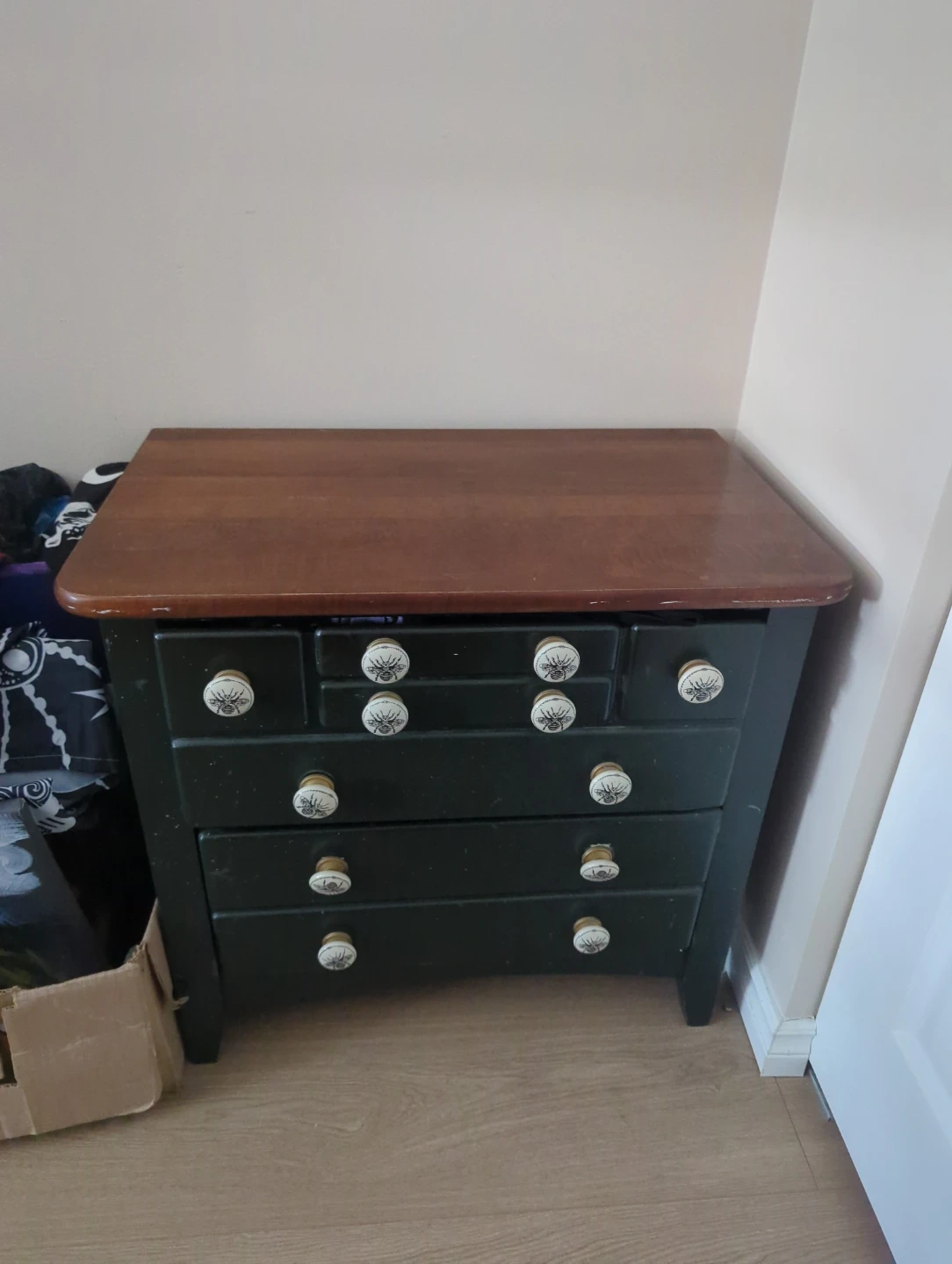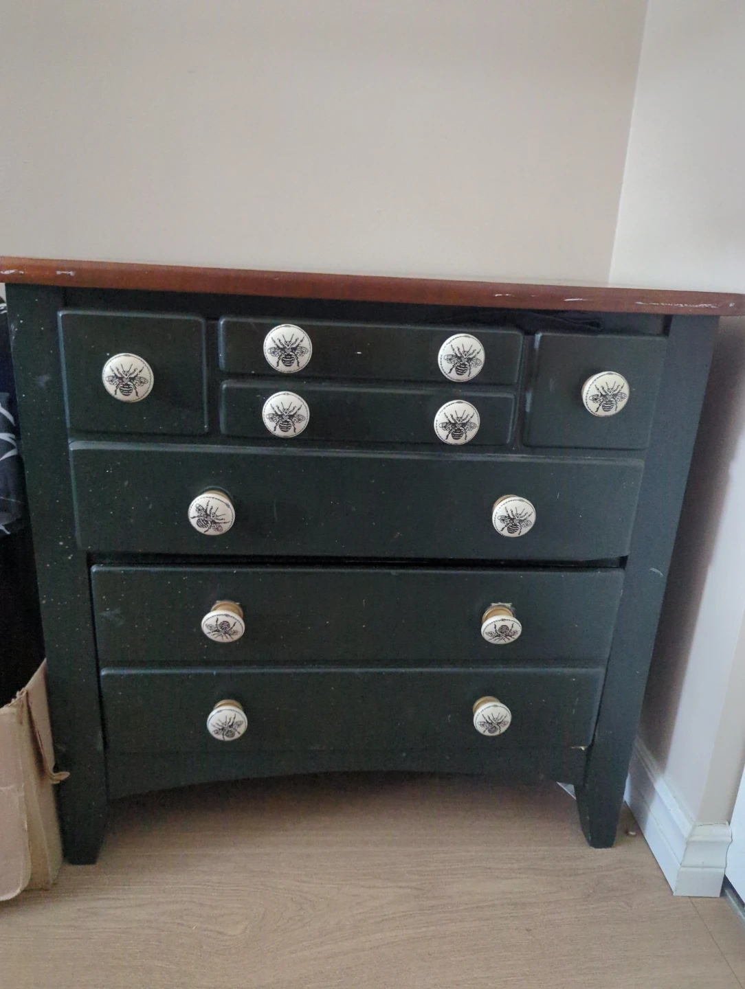 This is a dark green dresser with a wooden top. It has seven drawers, each with a unique ceramic knob featuring a bee design. It's a charming piece for any bedroom!