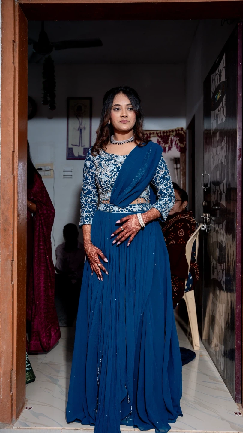 An elegant teal blue lehenga set in size M, crafted in soft georgette for a graceful and flowy silhouette. The lehenga is subtly embellished for a refined sparkle, making it perfect for engagement ceremonies and festive occasions.