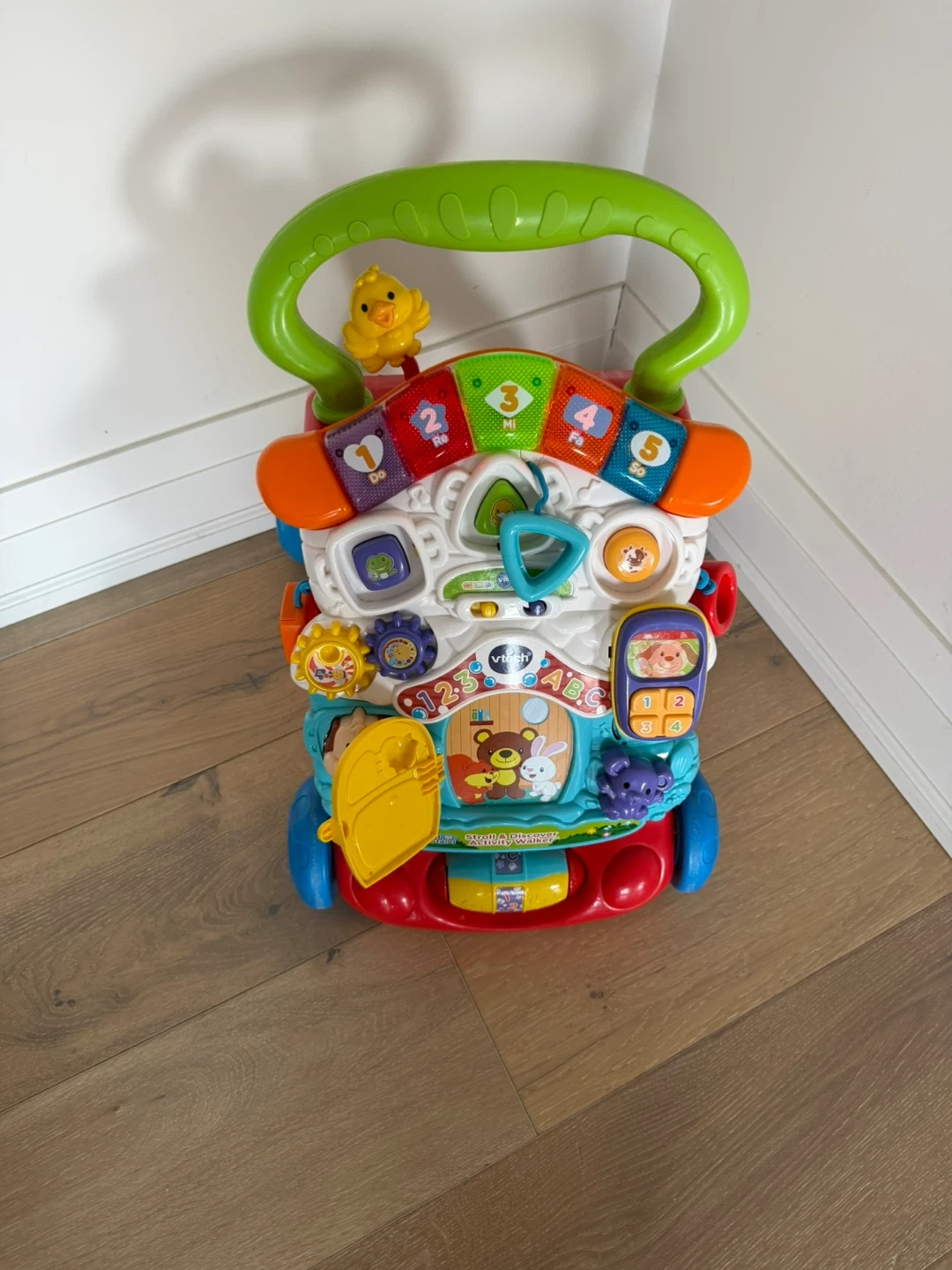 This VTech learning walker is designed to grow with your child, offering engaging activities. It converts from a floor toy to a walker. It has multiple interactive learning stations with colourful buttons and fun sounds.
