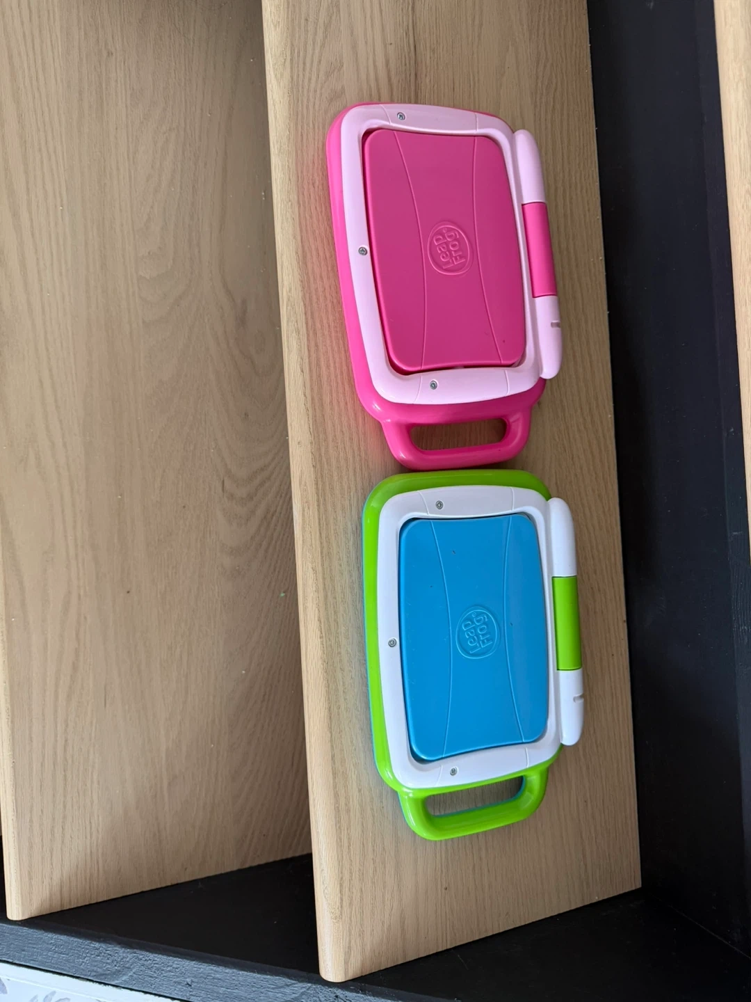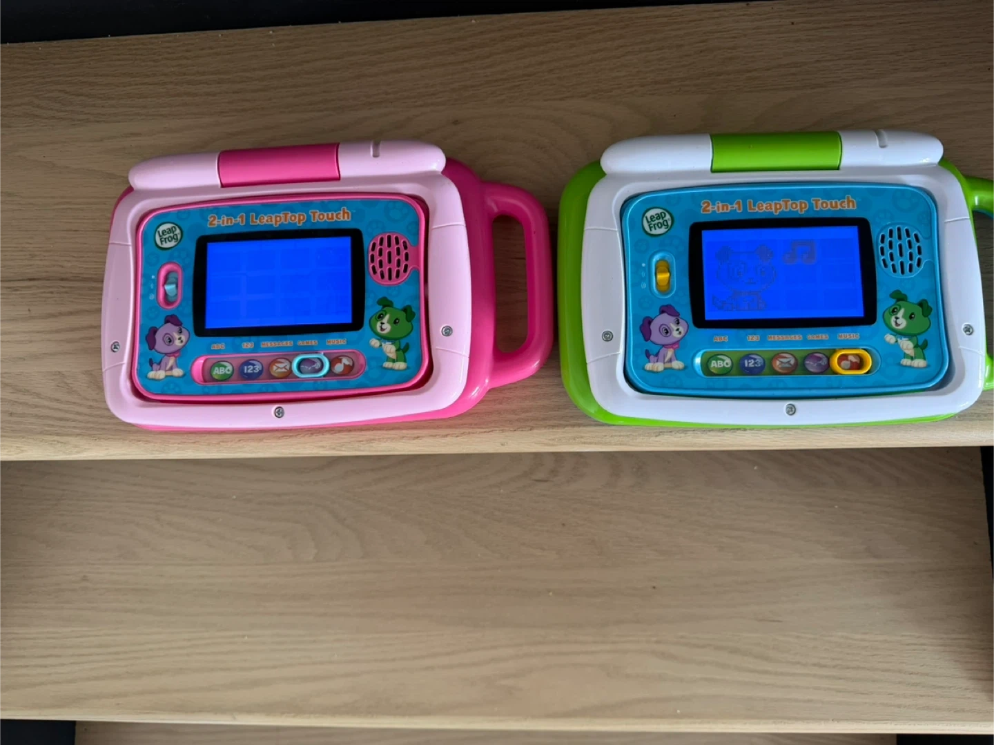 This is a set of two LeapFrog 2-in-1 LeapTop Touch learning toys. One is pink and the other is green. They're designed for young children to learn and play. These encourage early learning skills! $20 each one.