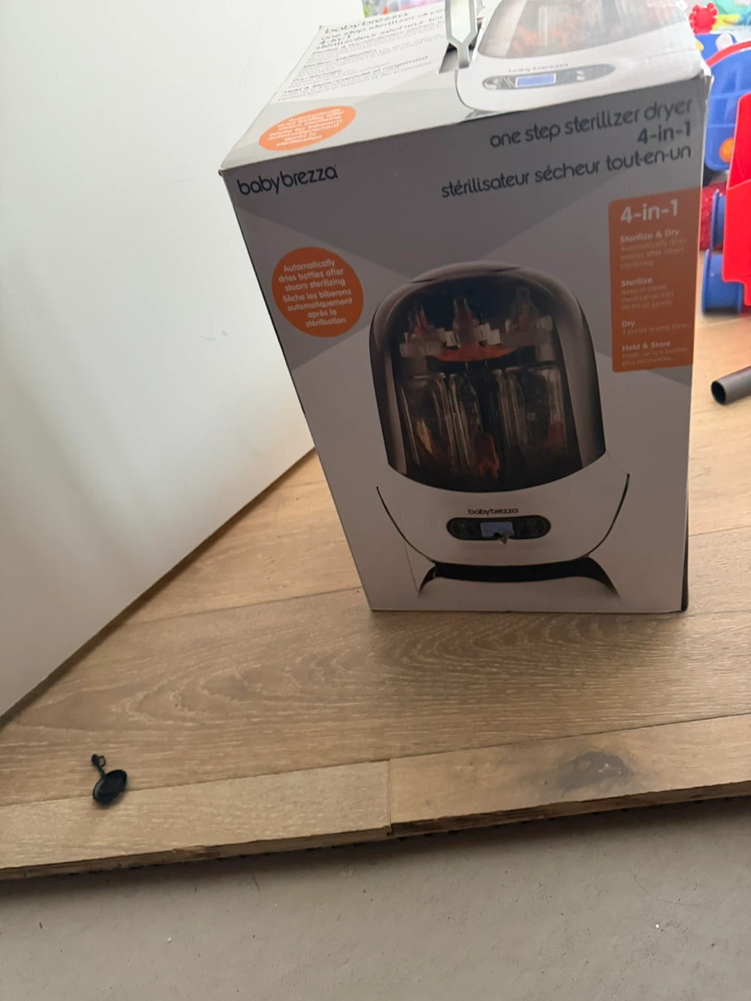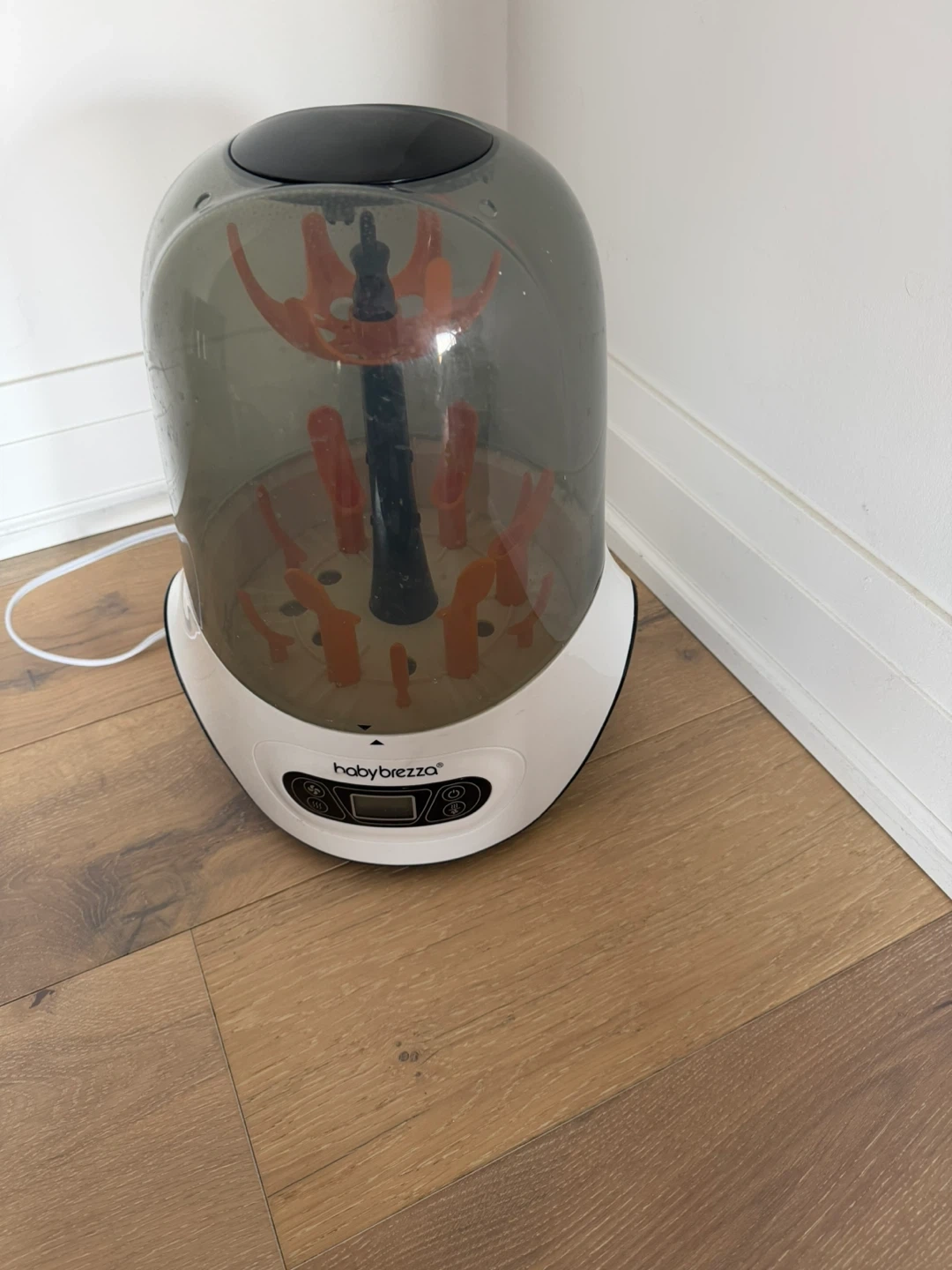 Baby Brezza one step sterilizer dryer. It sterilizes and dries bottles after washing. It can also hold and store sterilized items. It's a 4-in-1 unit. One orange holder has broke off but I still used it and works well. It may be able to be reattached. Still works like new.