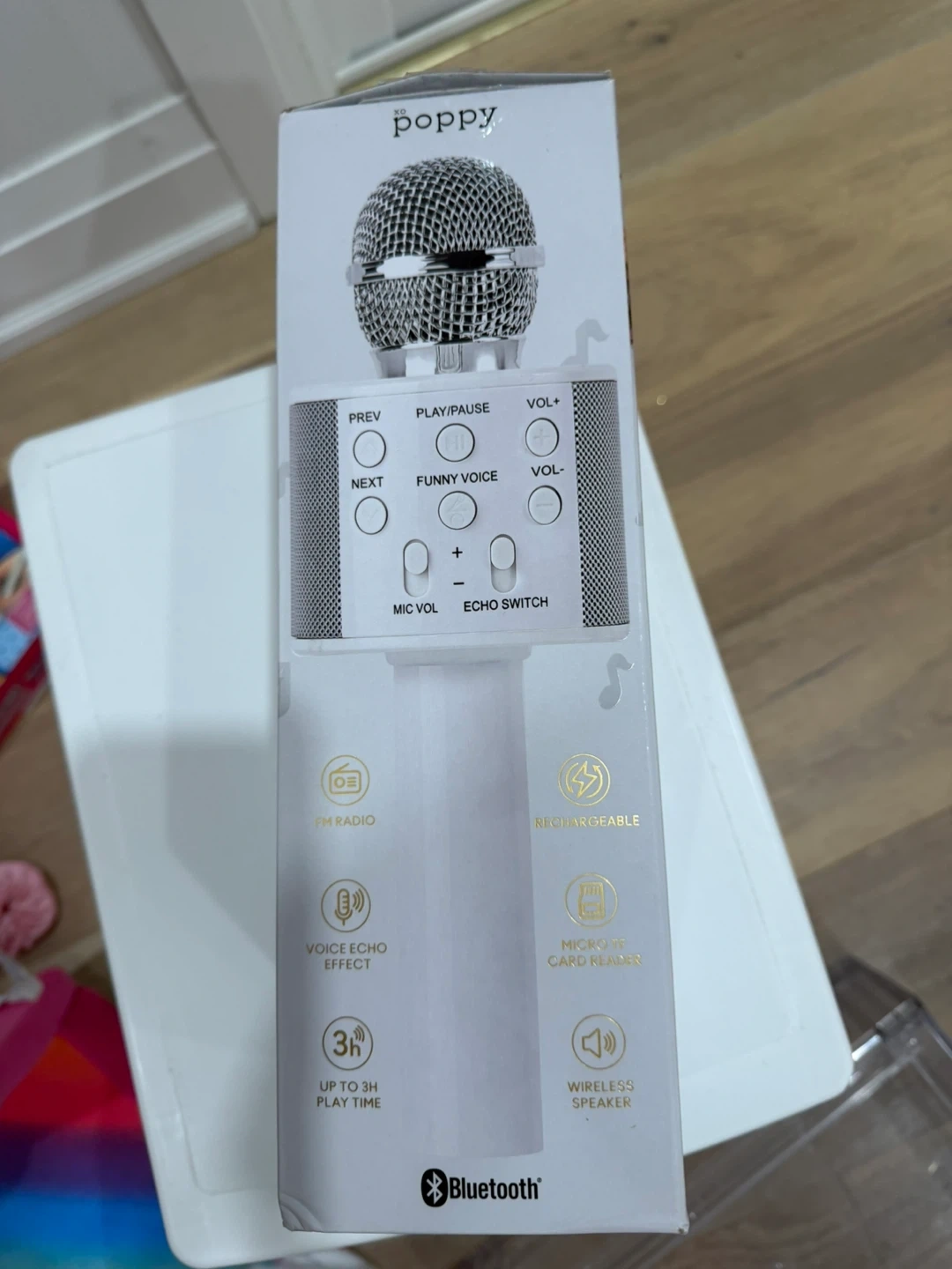Brand new, This Poppy karaoke wireless mic connects via Bluetooth. It features voice echo effect and full controls. It has up to 3 hours of play time on a single charge. A Micro SD card slot is included for music playback.