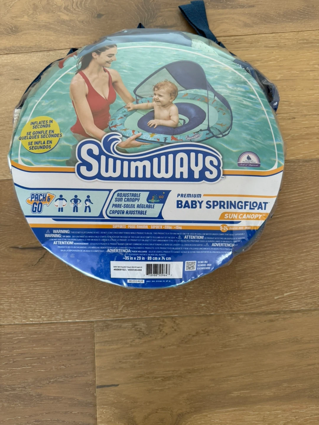 This Swimways baby float features an adjustable sun canopy to protect your little one from the sun. It inflates in seconds and is designed for babies aged 9-24 months. Supports up to 33 lbs.