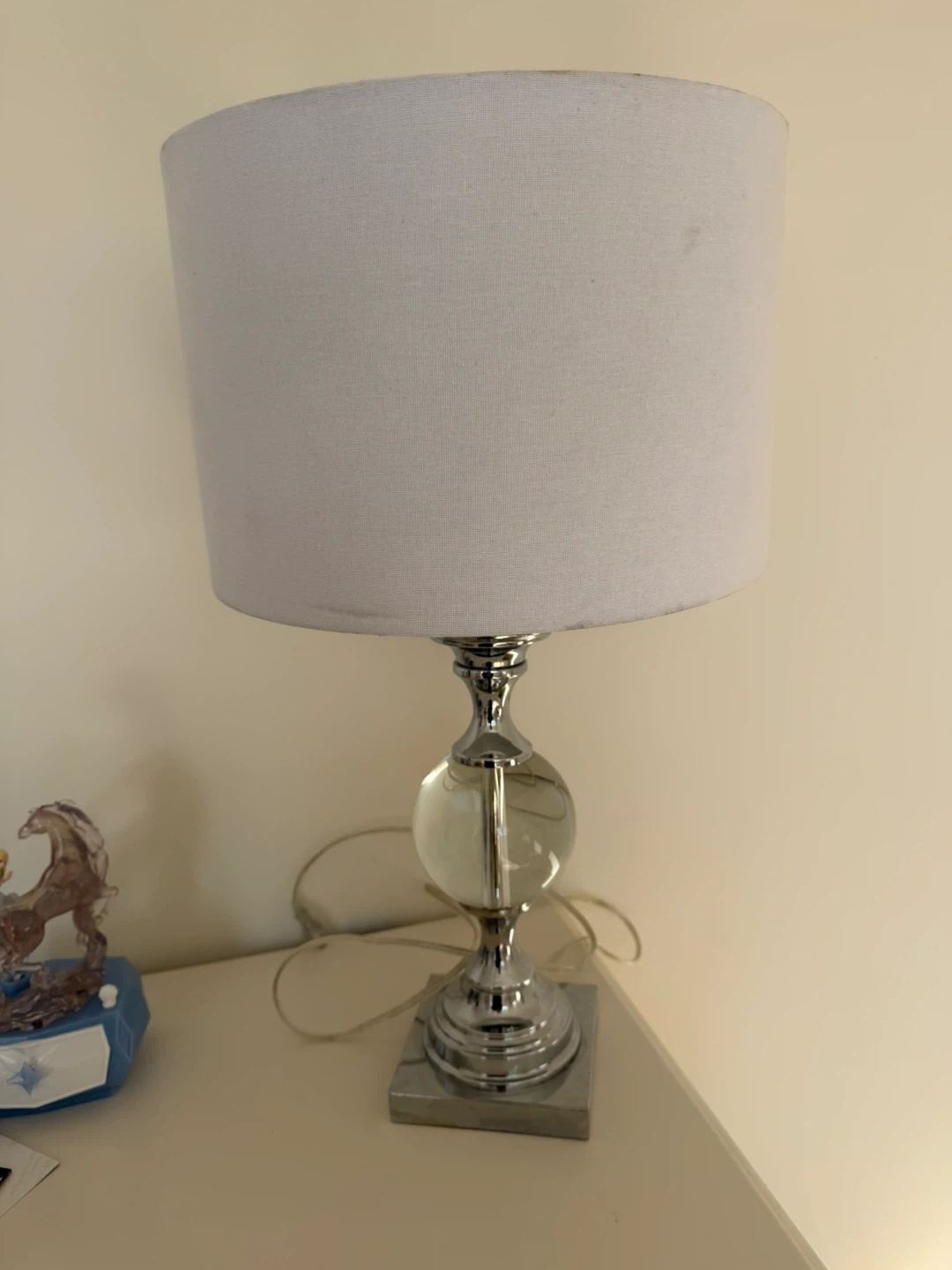 This stylish table lamp features a chrome base with a clear crystal orb accent. It has a simple white drum shade. The lamp's modern design adds a touch of elegance to any room. It's perfect for a bedside table or living room accent. Shades are all dirty. Two lamps. Open to negotiations. $25 each lamp. Final sale.