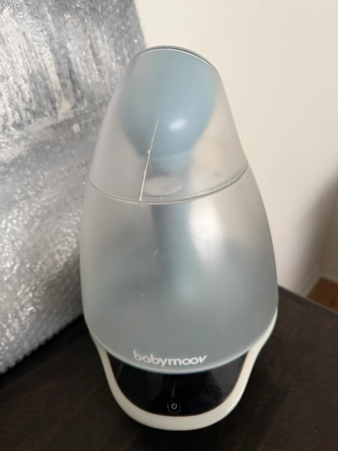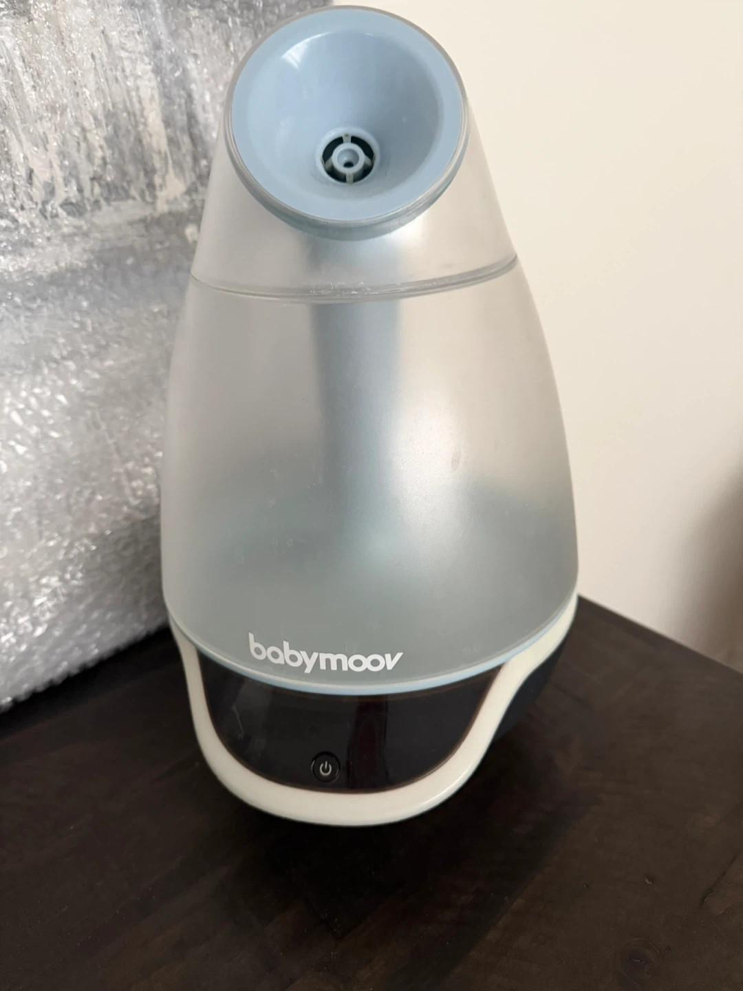 Babymoov humidifier with a light blue top and frosted white body. It features a power button on the front. This item is suitable for nurseries. It works well. Just one little crack on the top of the removable lid.