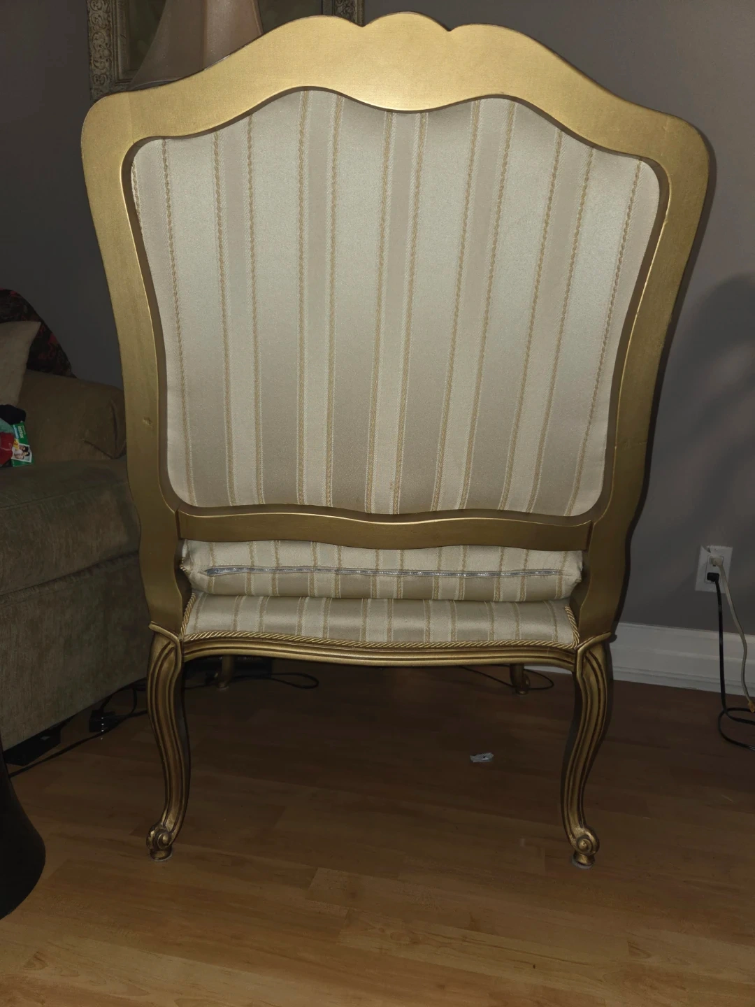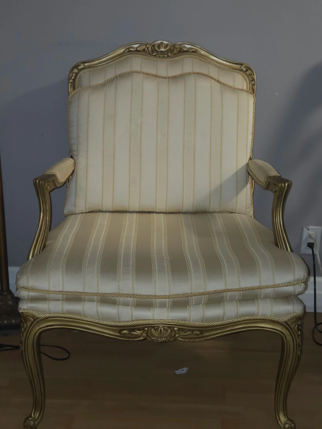 Elegant armchair with a gold ornate frame and plush, striped fabric upholstery. It's a beautiful accent piece for any room. This chair would add a touch of vintage charm to your living space. Features rolled arms and carved cabriole legs.