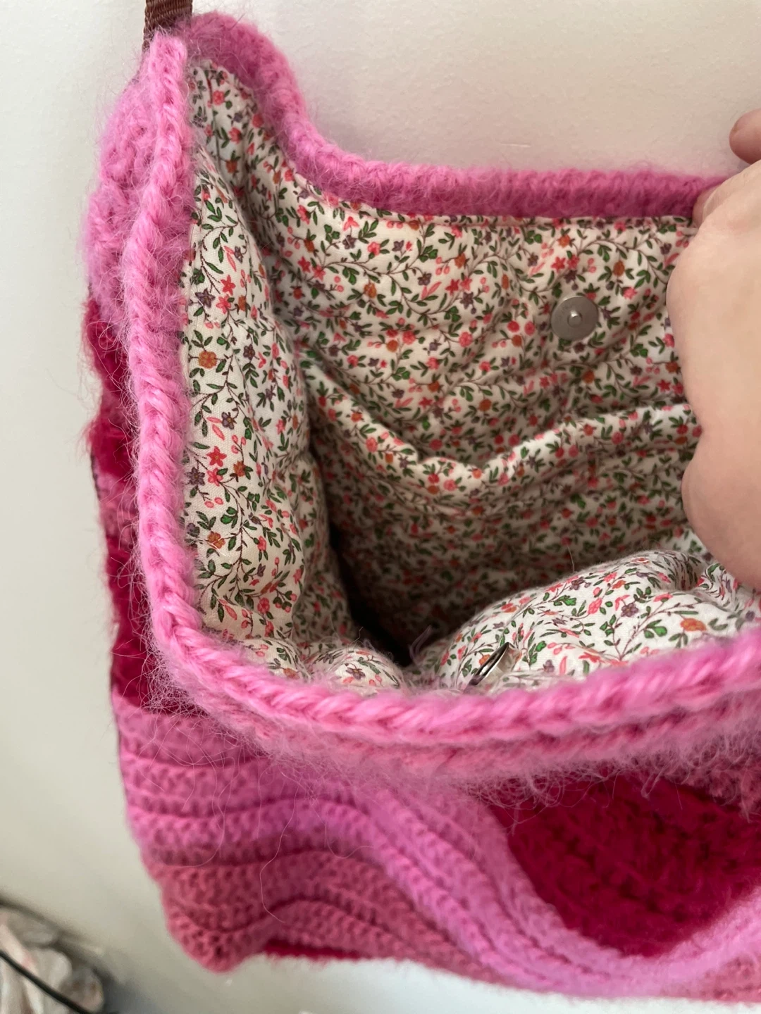 Handmade shoulder bag with colourful pink stripes. It's lined with a floral fabric and has a secure snap closure inside. A stylish everyday bag for essentials!