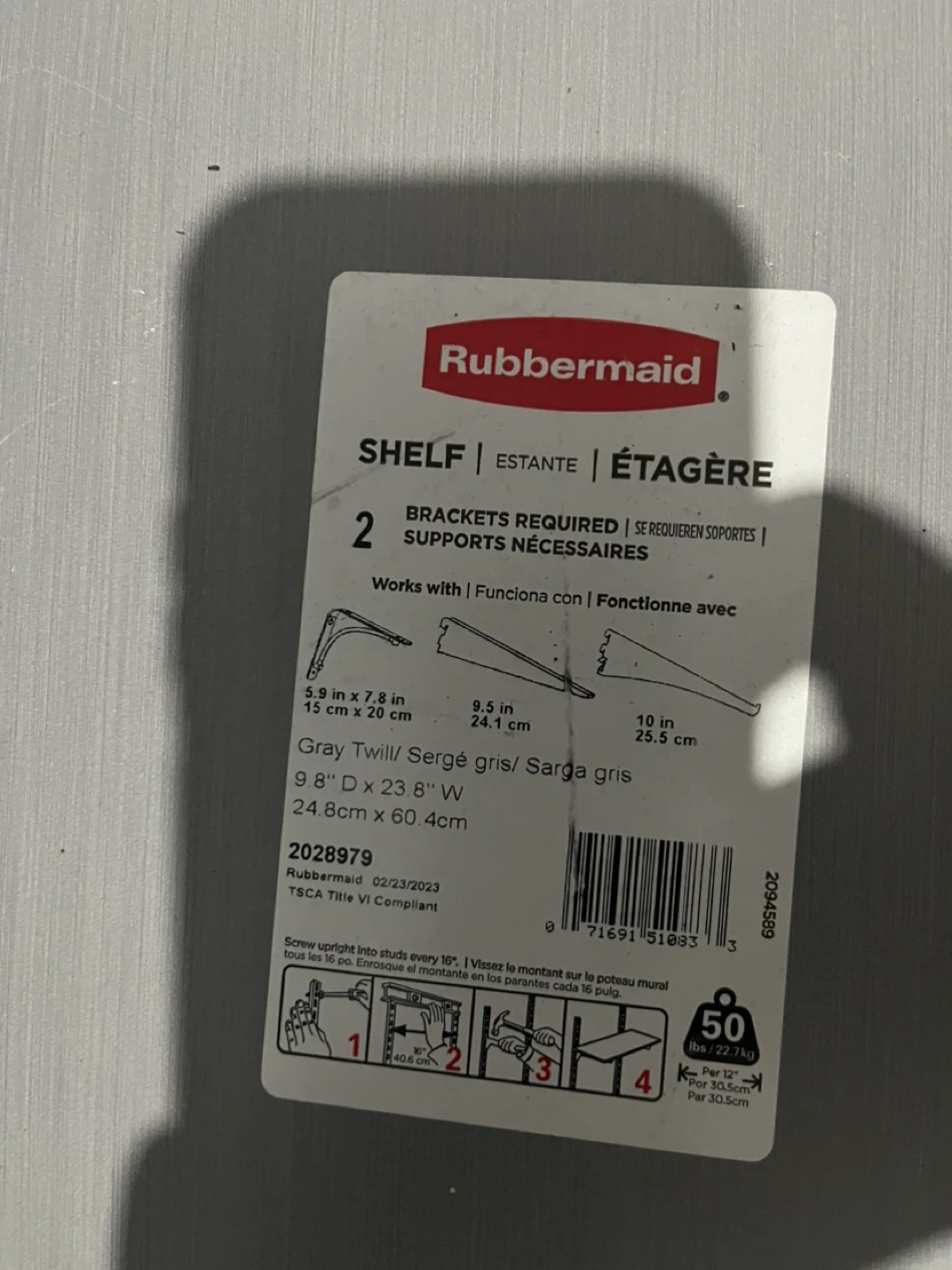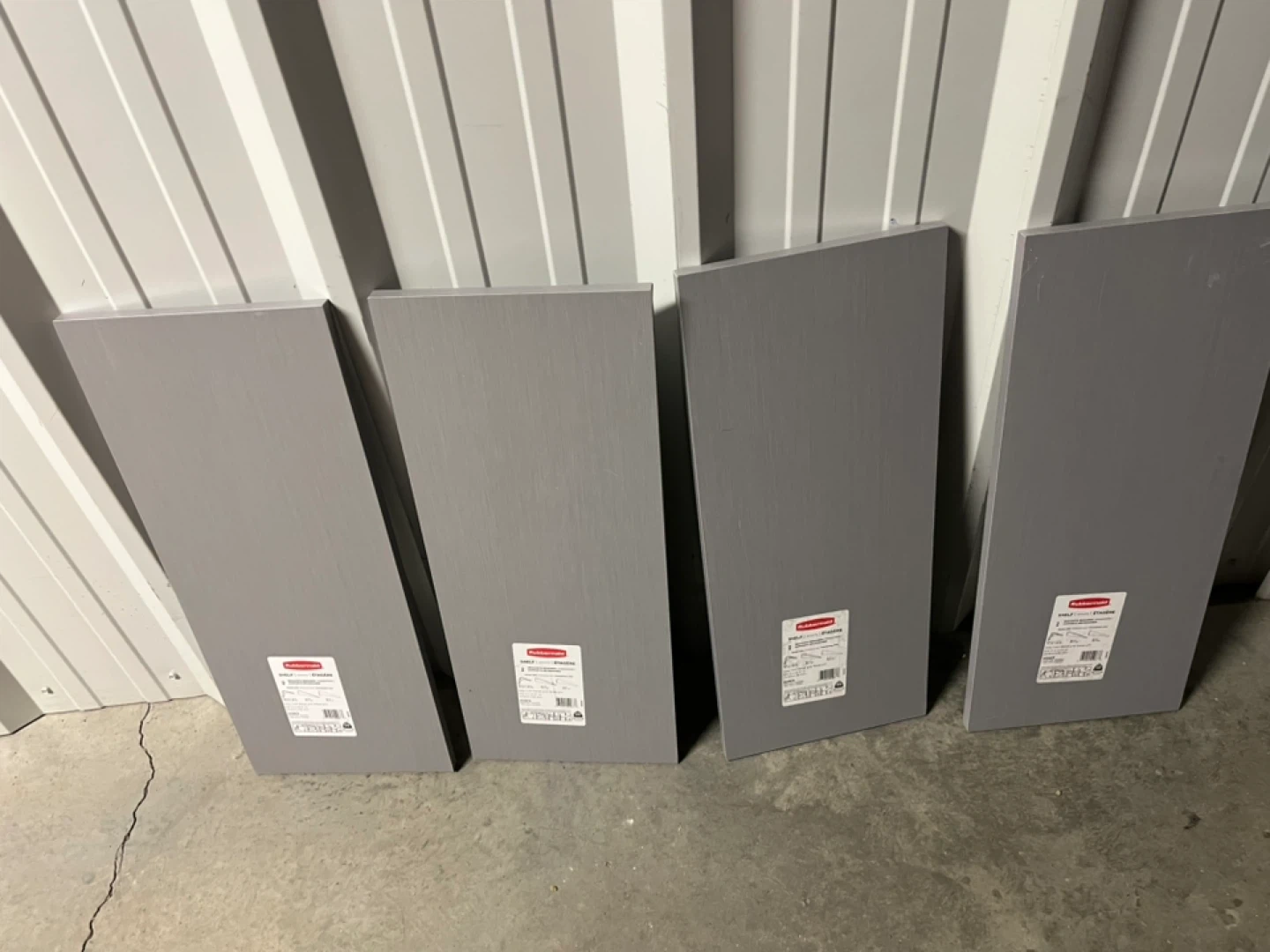 Selling all 4 Rubbermaid shelves in Grey Twill together. Each measuring 9.8" D x 23.8" W. The shelves have a weight capacity of 50 lbs. Brackets are required for installation.