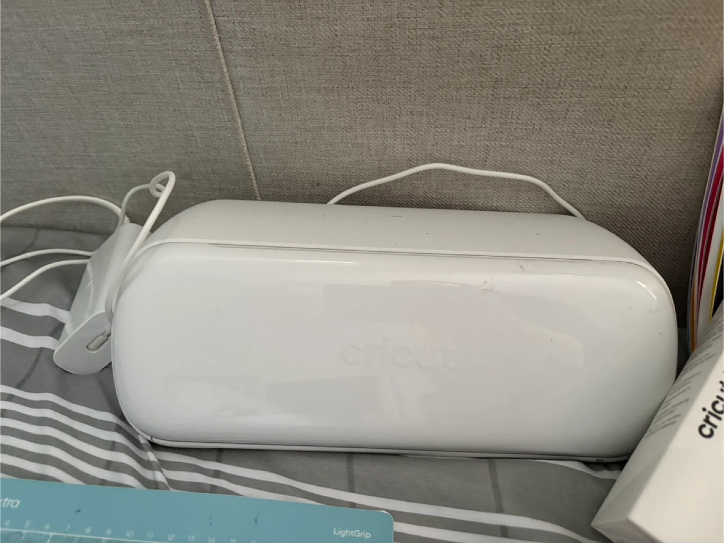 Bundle includes a white Cricut cutting machine, a cutting mat, weeding tools, and various sheets of coloured vinyl and card stock. It's great for crafting projects!