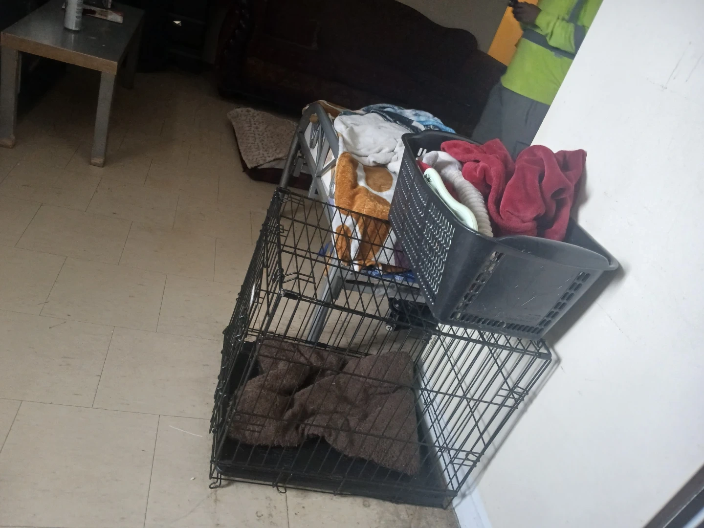 Wire dog crate with a brown blanket inside. It's suitable for small to medium-sized dogs. Collapsible for easy storage. Great for travel or home use!