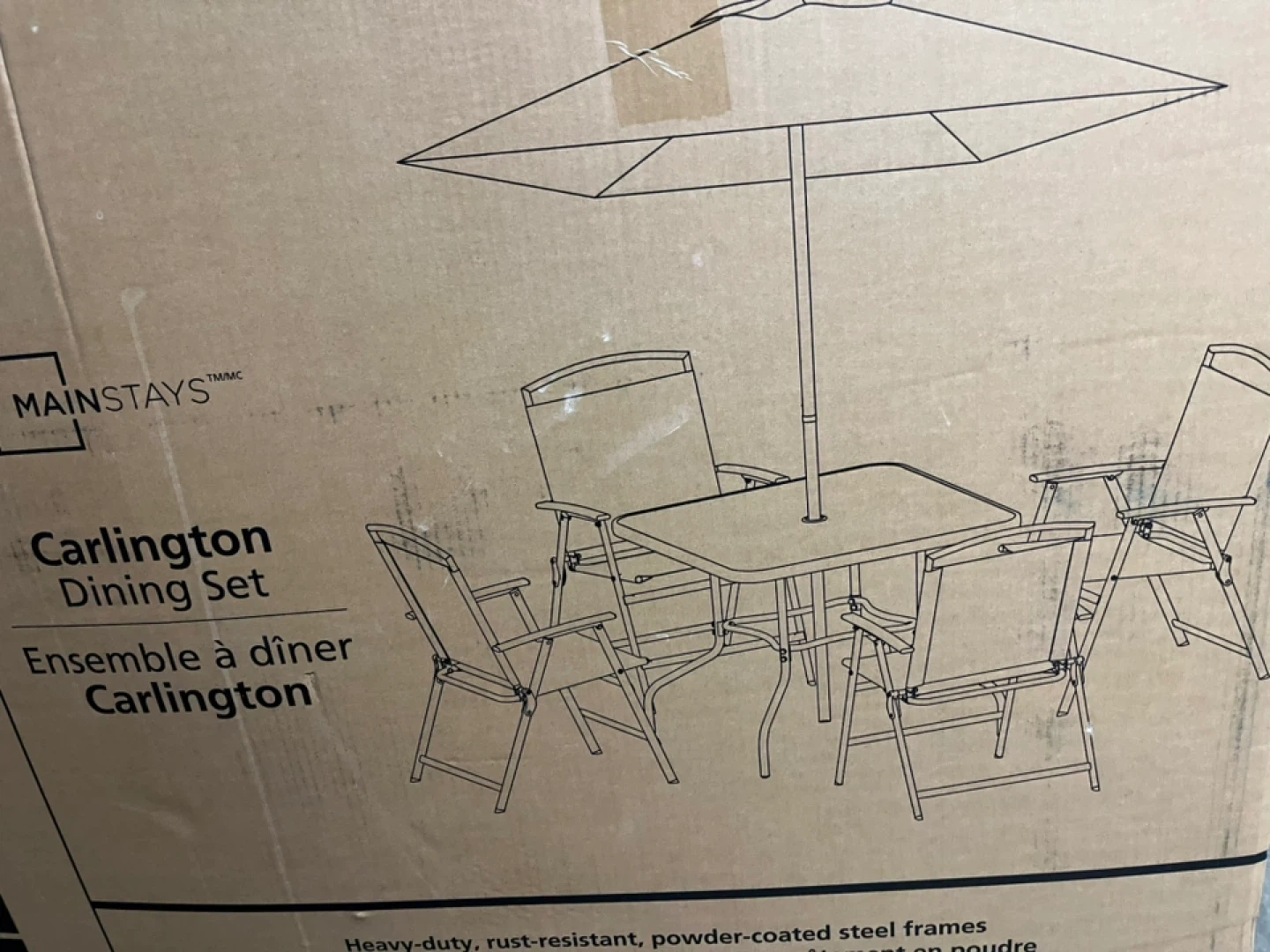 This Mainstays Carlington Dining Set includes a table and two chairs. The frames are heavy-duty, rust-resistant, and powder-coated steel. This set is perfect for enjoying meals or relaxing outdoors.