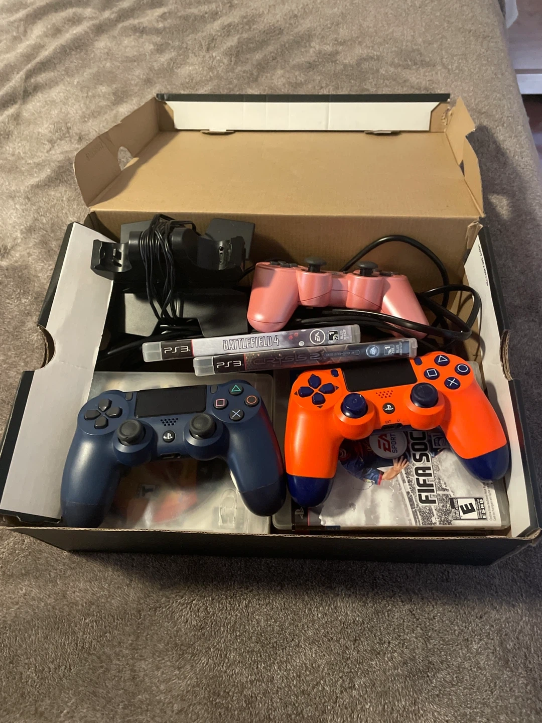 Selling a complete gaming bundle with everything included, ready to play. The PS4 Slim console works perfectly but has no games installed, and the PS3 Slim console also works perfectly. The bundle includes 19 PS3 games, 14 physical and 5 digital. There are 2 PS4 controllers and 1 PS3 controller included, along with a charging station for the PS4 controllers and all necessary power and HDMI cables. Both consoles are in great working condition, the controllers are fully functional, and everything has been tested. This is a perfect bundle for retro gaming or modern gaming. The console system software is up to date and the bundle is excellent for collectors or anyone looking for a complete setup. Price is $385 CAD and negotiable for serious buyers.