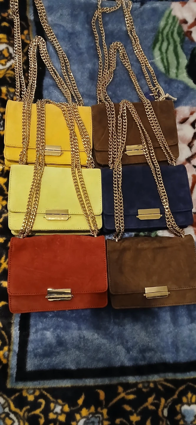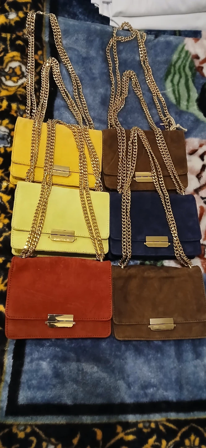 Each purse has a gold-tone metal clasp and a long gold-tone chain strap.