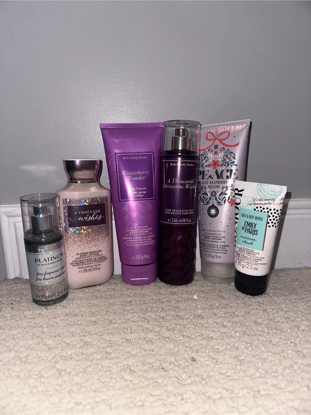 This lot includes Bath & Body Works lotions and body creams in various scents. Items include Platinum Fine Fragrance Mist, A Thousand Wishes, Winterberry Wonder, A Thousand Christmas Wishes, Peace Iced Raspberry Bellini, and Emily in Paris Macaron Cloud.