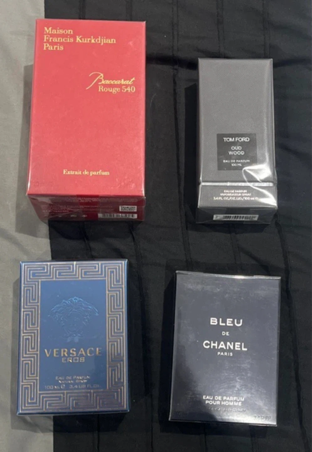 Four brand new, unopened perfumes. Includes Maison Francis Kurkdjian Baccarat Rouge 540 Extrait de Parfum, Tom Ford Oud Wood Eau de Parfum 100ml, Versace Eros Eau de Parfum 100ml, and Bleu de Chanel Eau de Parfum Pour Homme. Perfect for any fragrance enthusiast!