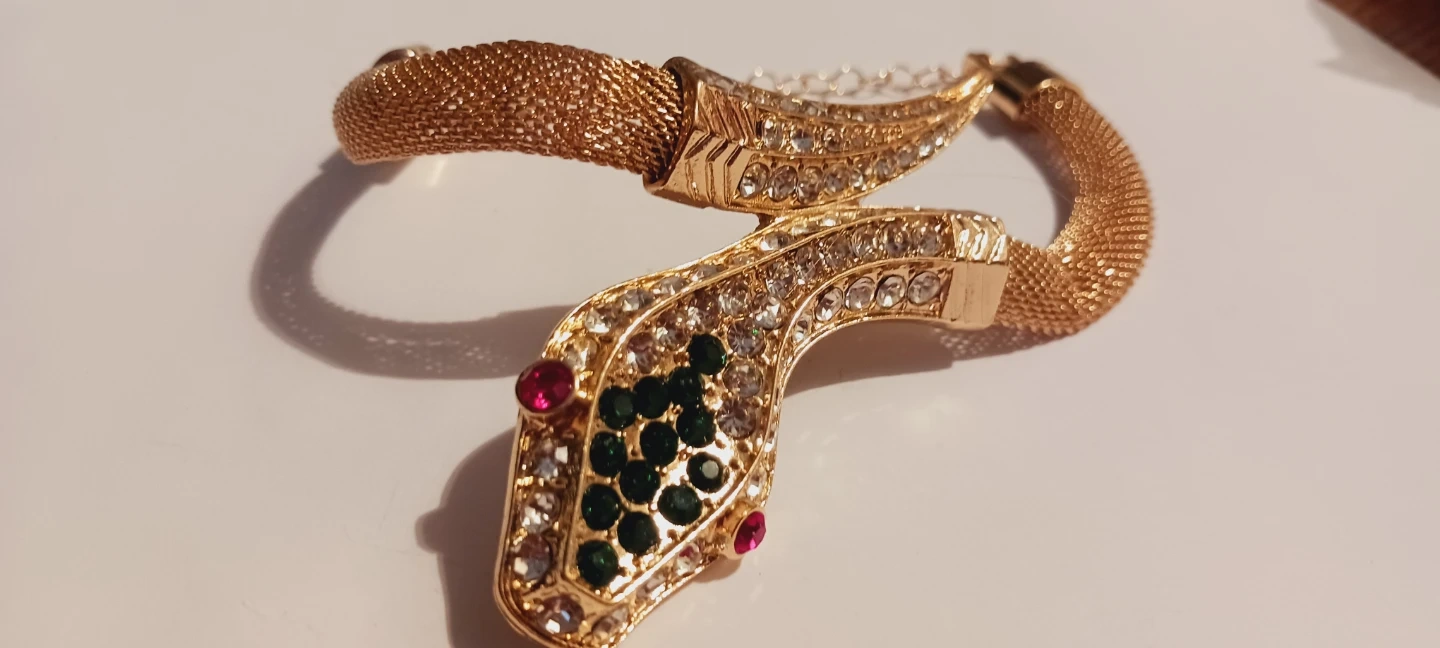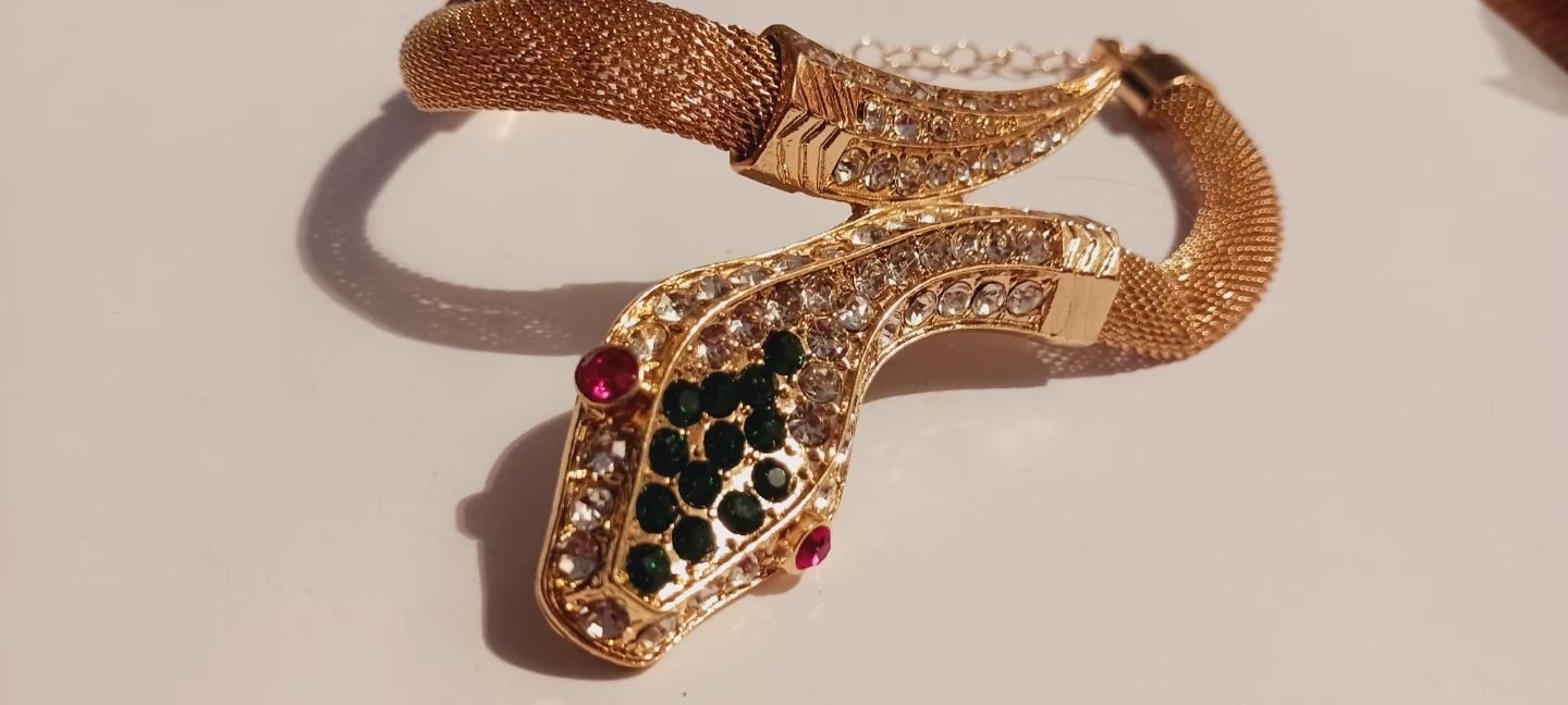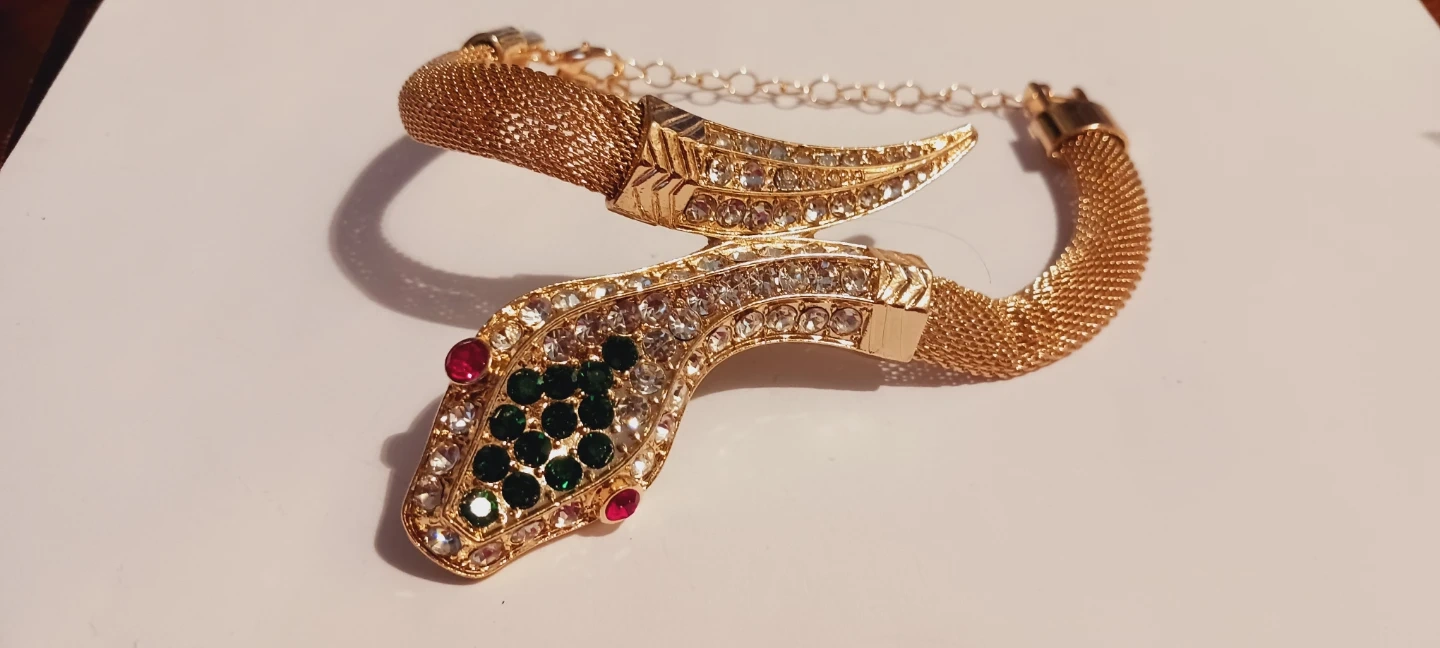 New !! Gorgeous Sparkling ✨️ gold tone bracelet features a striking snake design. It's adorned with clear and green rhinestones for a lot of sparkle. The mesh band offers a unique texture. New !! Adjustable size. 9" long. ALL MY PRICES ARE NEGOTIABLE !!