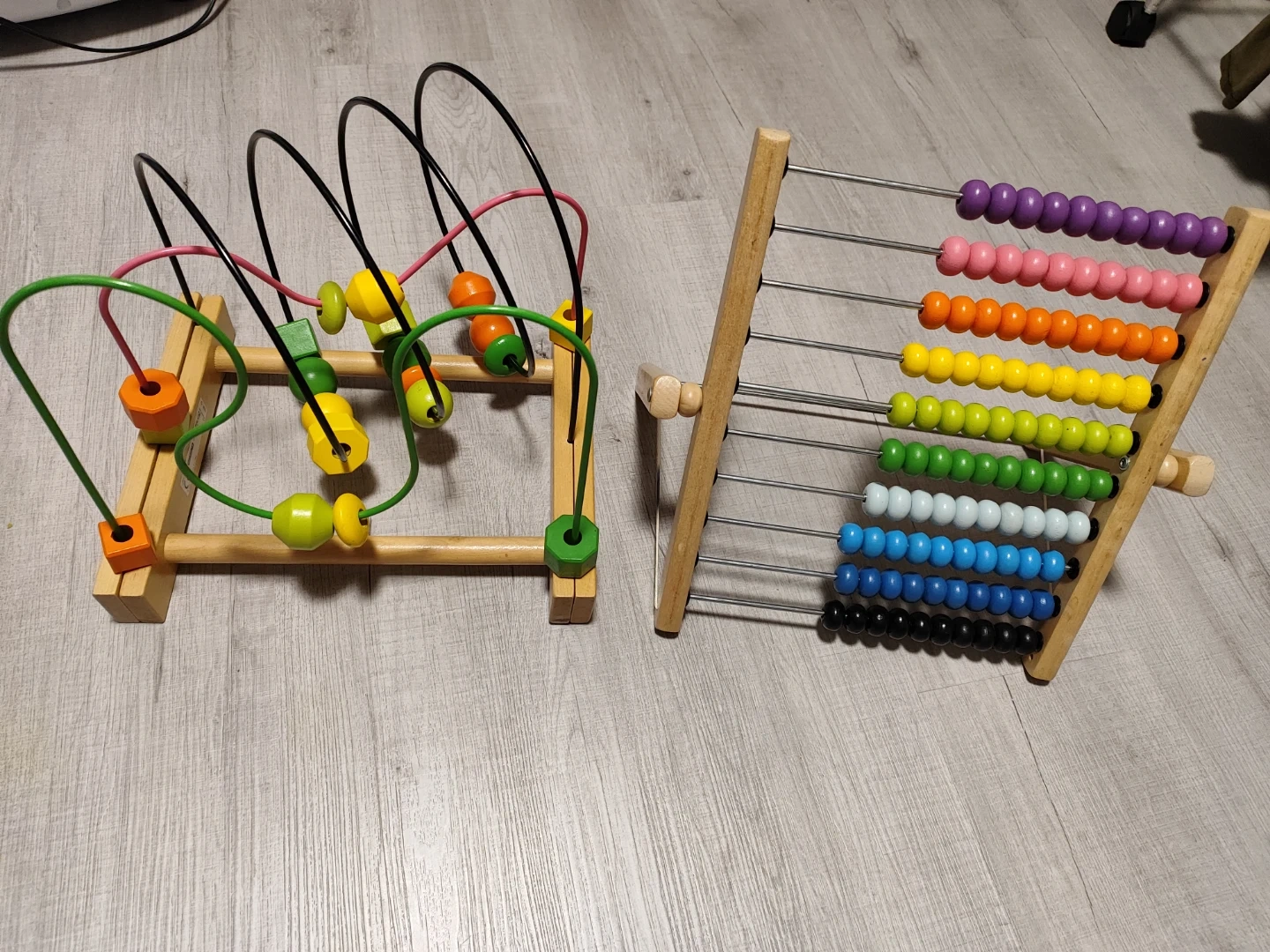 This set includes a classic wooden abacus with colourful beads and a wooden bead maze toy. Both are great for developing fine motor skills and early math concepts. These toys are made from wood and are colourful.