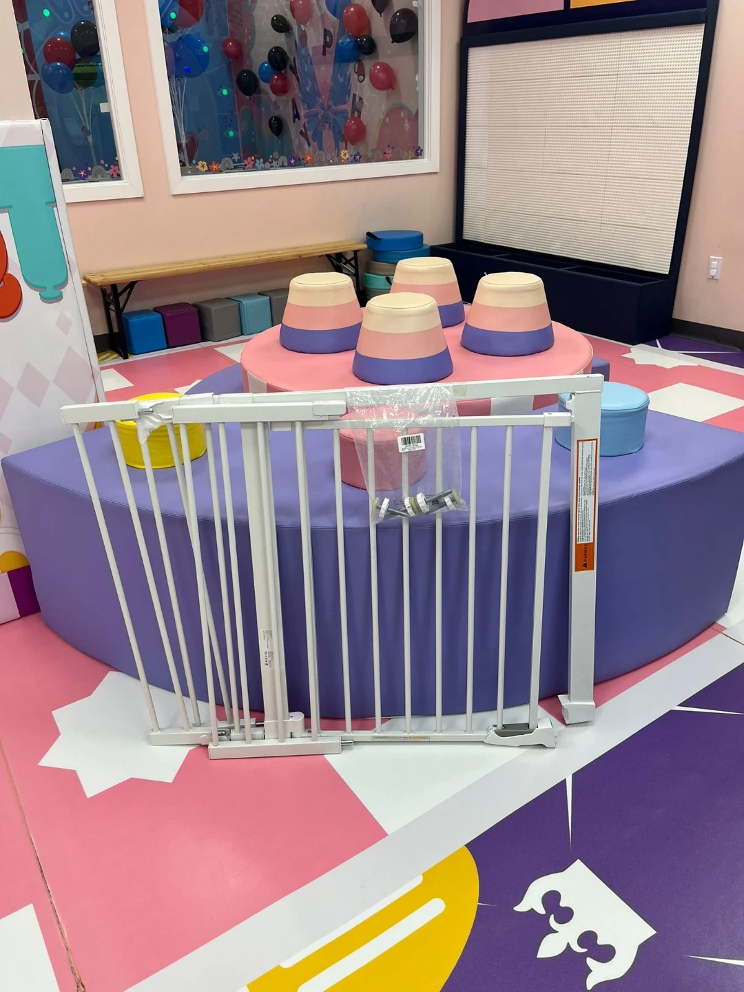 This is a white metal baby gate. It's a pressure-mounted style with a walk-through door. Includes hardware for installation. Suitable for doorways and staircases.