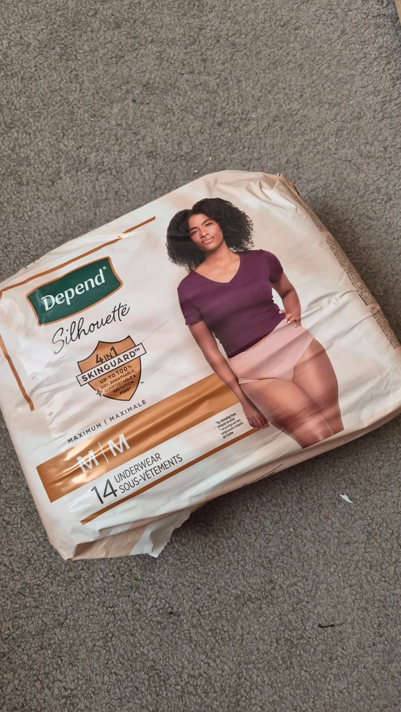 Depend Silhouette women's underwear offers maximum absorbency with 4-in-1 SkinGuard protection. This is a size medium, and there are 14 pairs included.