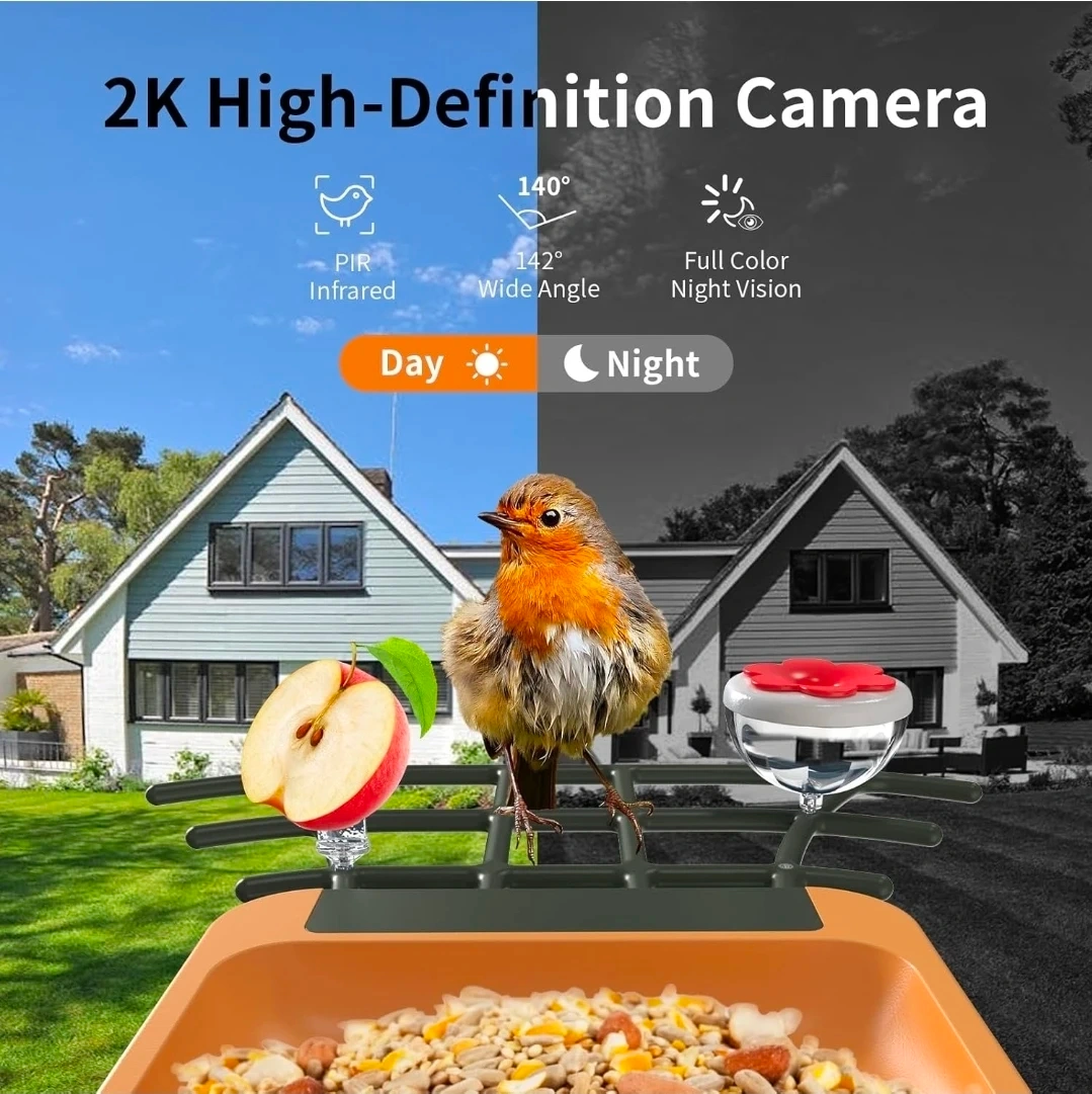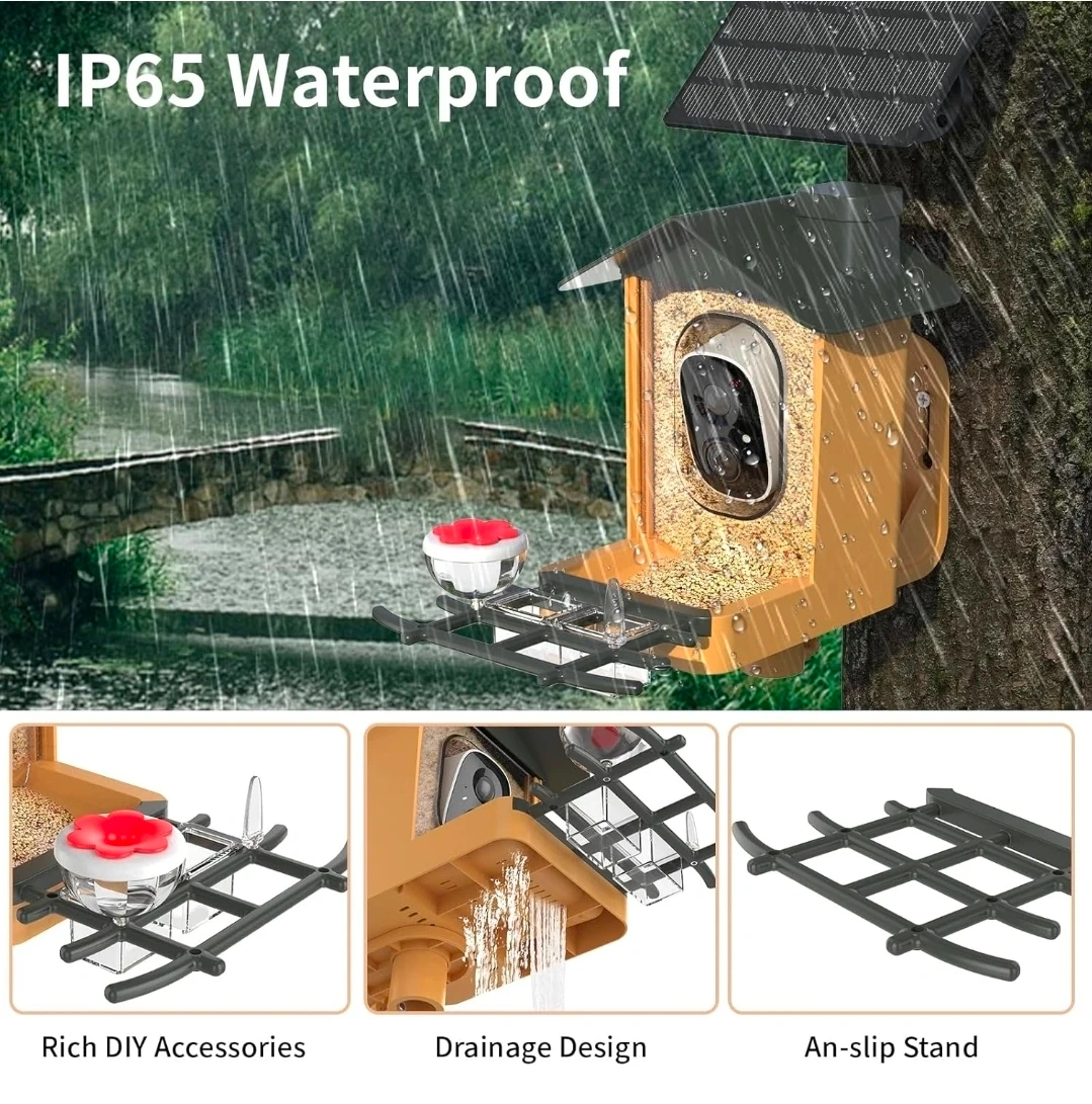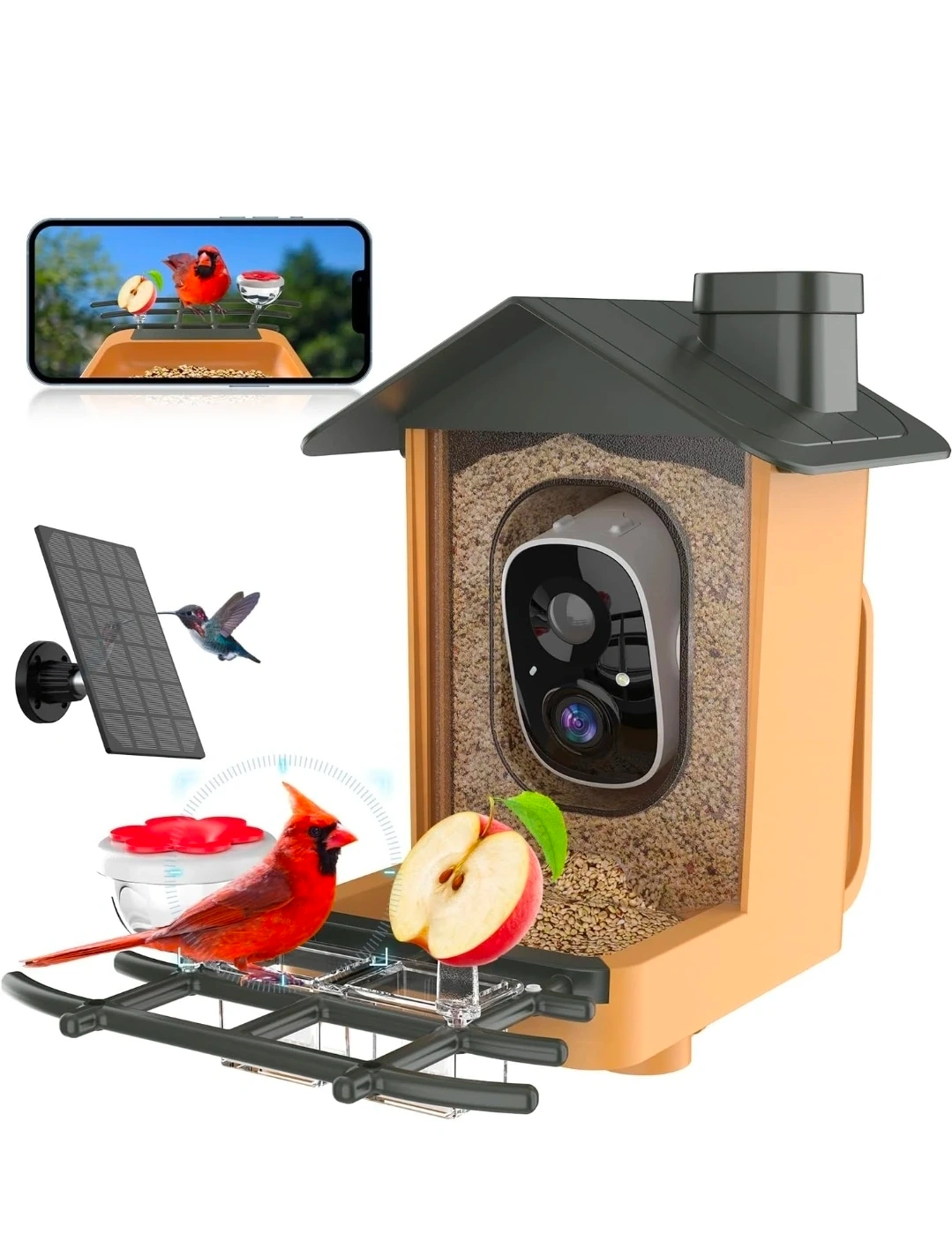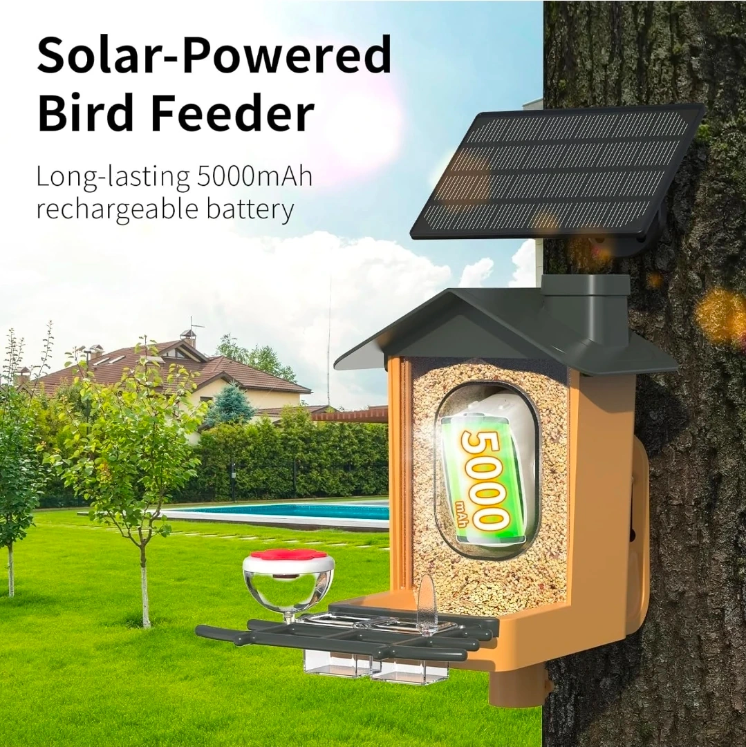 This solar-powered bird feeder includes a 2K high-definition camera with a wide 140-degree angle, PIR infrared, and full-color night vision. It's powered by a 5000mAh rechargeable battery and connects to an app for instant notifications. The feeder identifies over 10,000 species of birds! It's great for watching birds in your backyard.