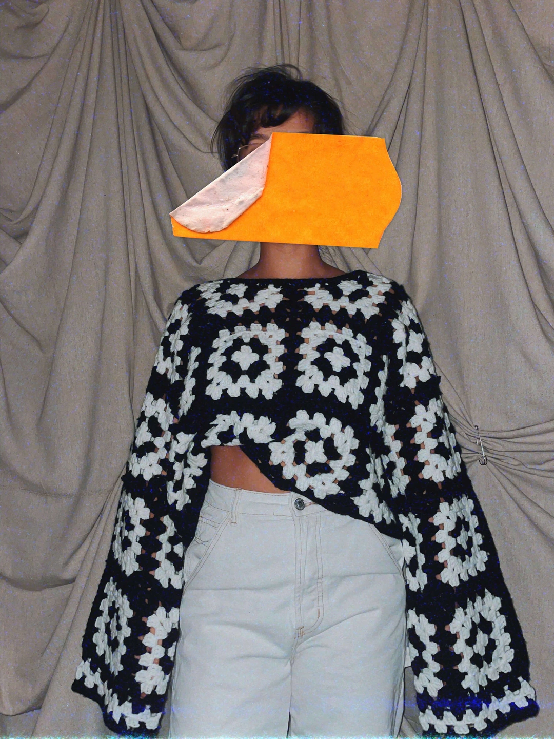 black and white crochet flower tile long oversized boxy bell sleeve sweater loose fit