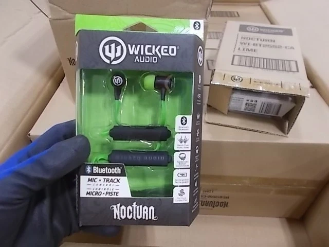 These Wicked Audio Nocturn earbuds connect wirelessly via Bluetooth. They feature mic and track control for easy management of calls and music. The earbuds are rechargeable.