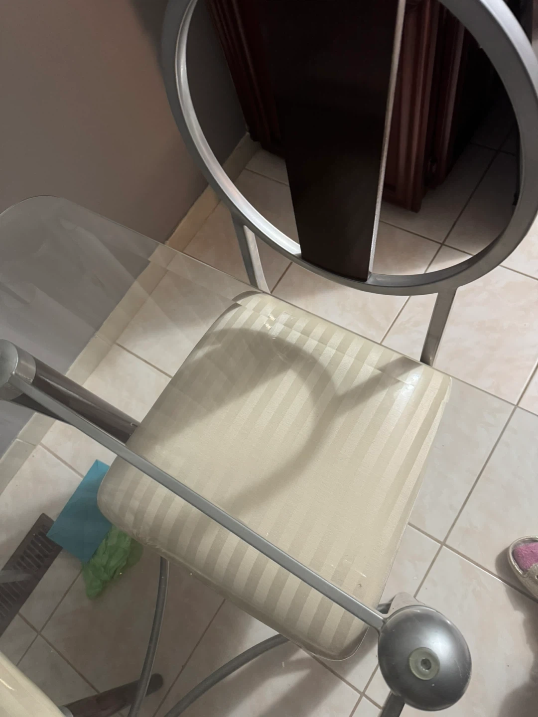 This is a stylish glass dining table set complete with four cushioned chairs. The chairs are upholstered in a cream-coloured fabric with subtle vertical stripes. It's a great set for smaller dining areas!