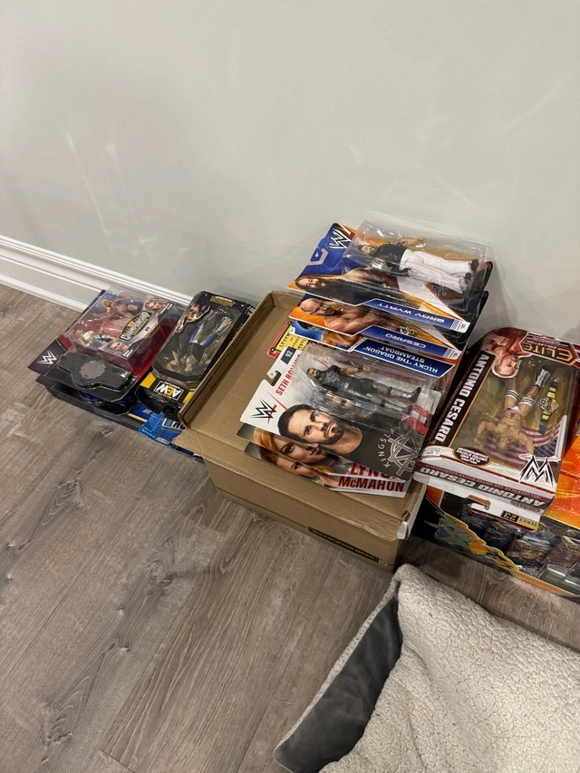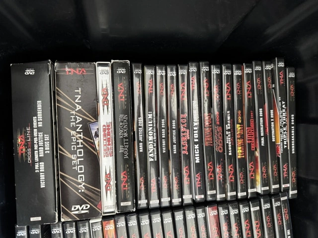 Huge WWE / Wrestling collection: 2 totes full of DVDs (including TNA, etc.), a binder with around 1,000 cards, and a box of sealed Elite/older figures. Selling the entire lot for $2,000 firm. Easily valued over $5,000. Serious interest only. Thank you.