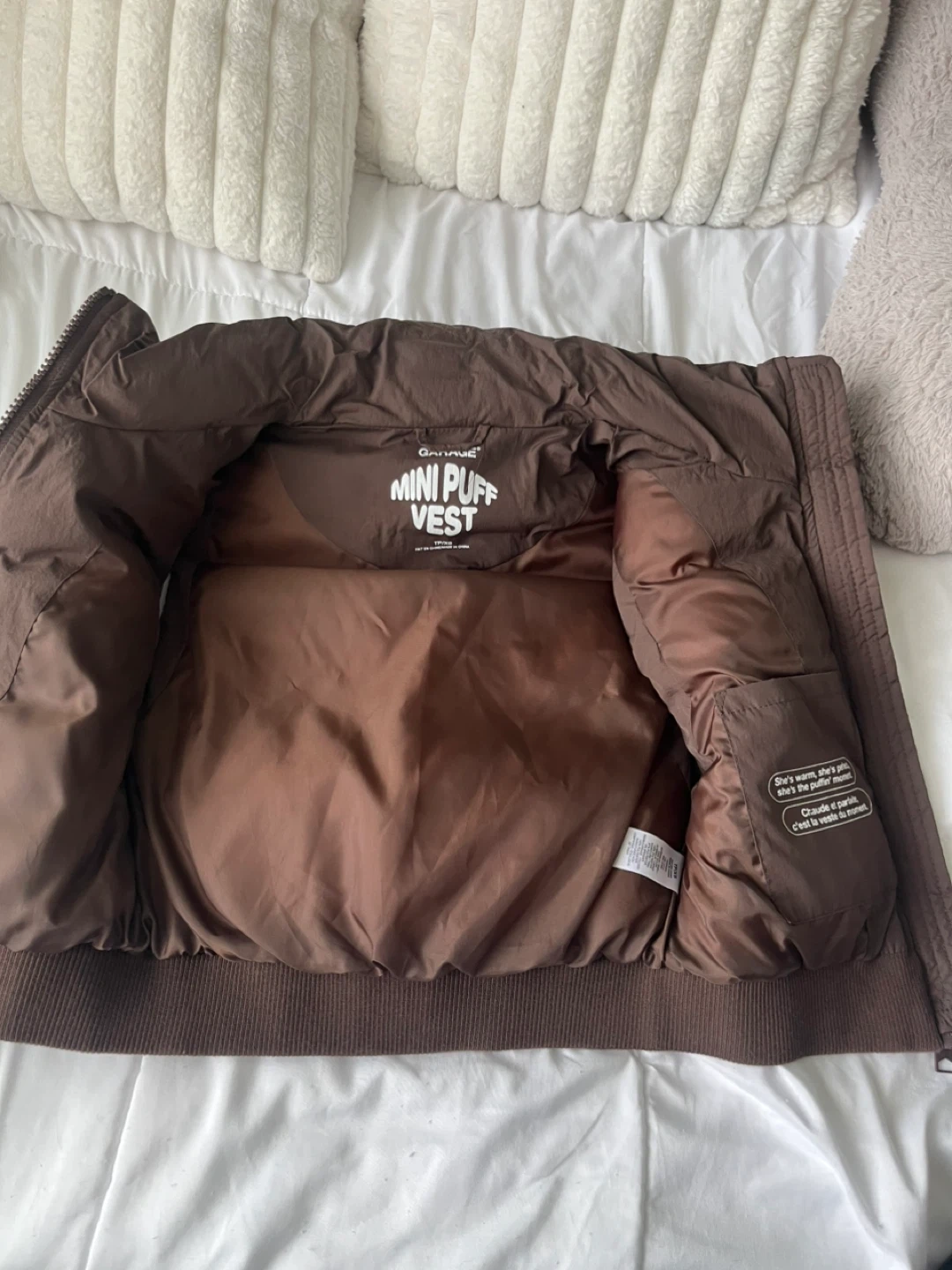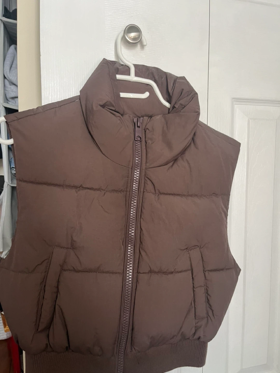 This is a brown, cropped puffer vest. Retails for $80. It features a zip-up front and a stand-up collar. The vest is made of a water-resistant material and has two side pockets. Great for layering during cooler weather!