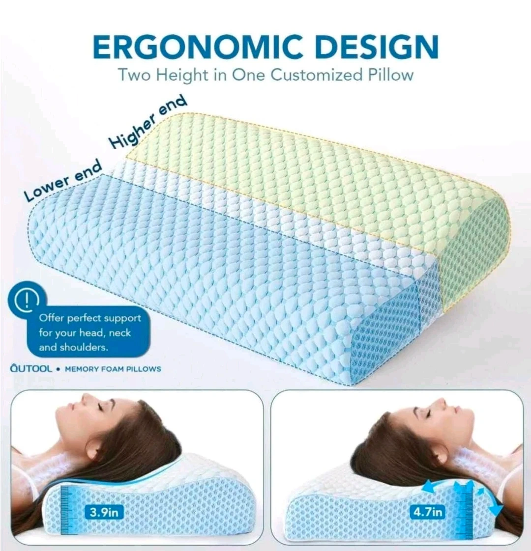 Qutool memory foam pillow features an ergonomic contour design for optimal head, neck, and shoulder support.