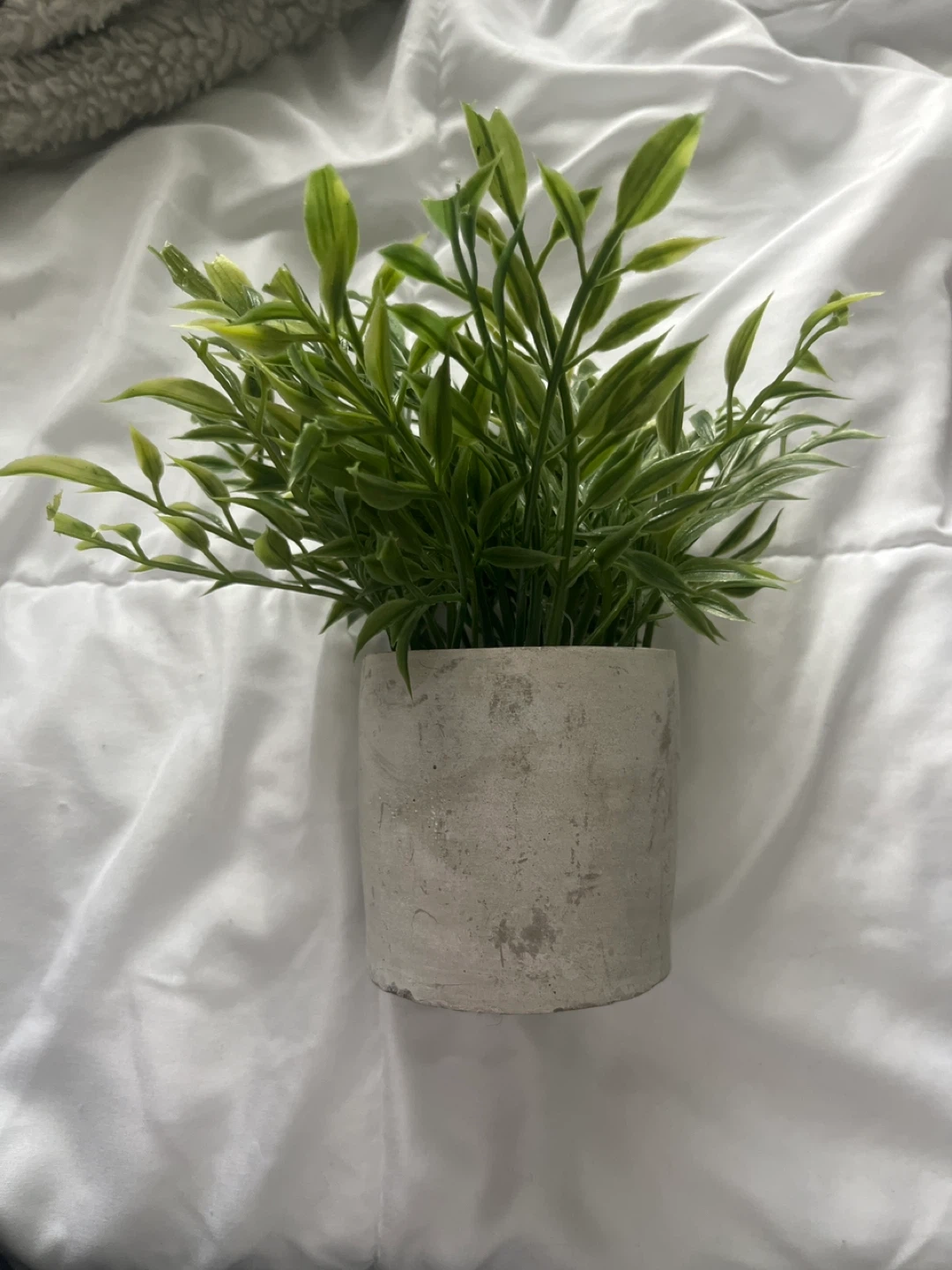 A lifelike artificial plant housed in a modern concrete pot. This plant requires no watering or maintenance, making it a hassle-free addition to any space. It's a great way to add a touch of greenery indoors.