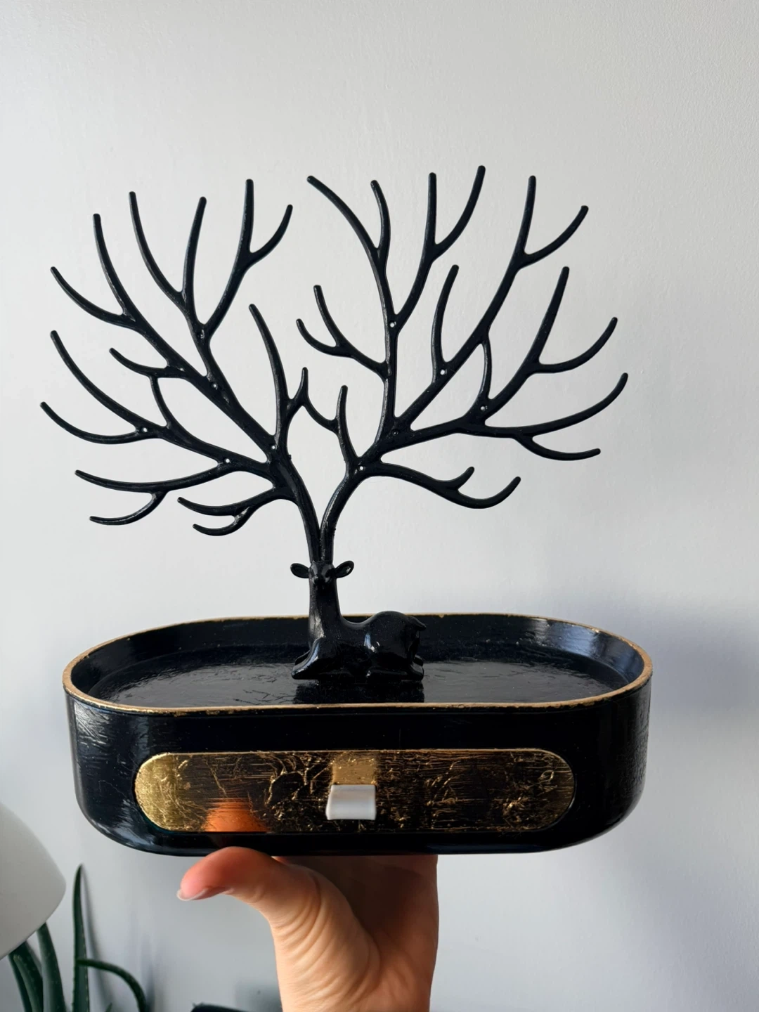 Decorative jewelry organizer with a tree branch design for hanging necklaces and earrings. Features a small pull-out drawer for storing rings or other small items. Black and gold finish.
