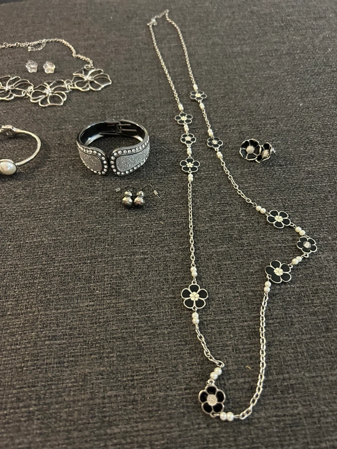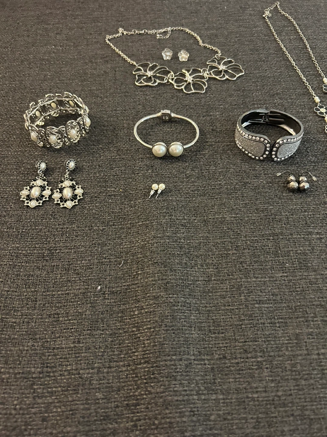 This lot includes a variety of women's costume jewelry. You'll find several necklaces with different pendants, bracelets, and matching earrings. Most pieces feature silver-tone metal with faux pearls and floral or abstract designs.