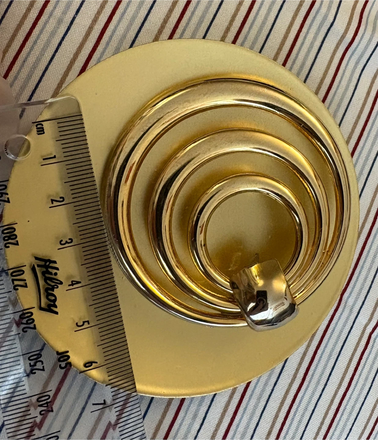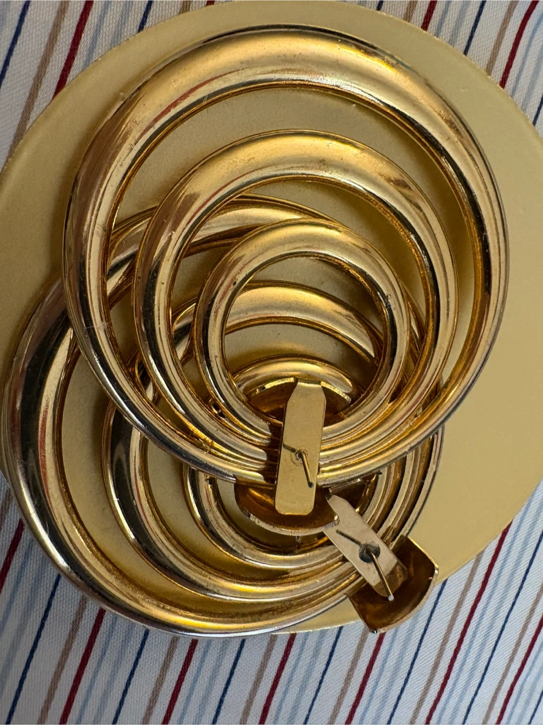 These striking gold tone vintage earrings feature a unique nested hoop design. The largest hoop measures approximately 2.5 inches in diameter, with several smaller hoops nested inside. They have post backs for secure wear. These earrings are perfect for making a statement with any outfit!