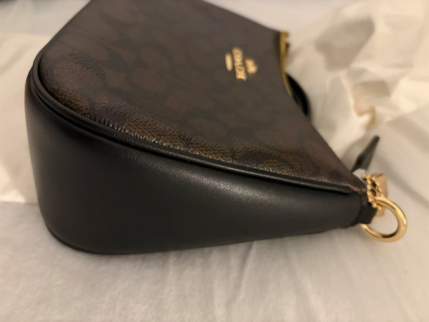 This is a Coach signature monogram wristlet bag. It features a zip-top closure and a leather trim. It's perfect for carrying your essentials when you're on the go!