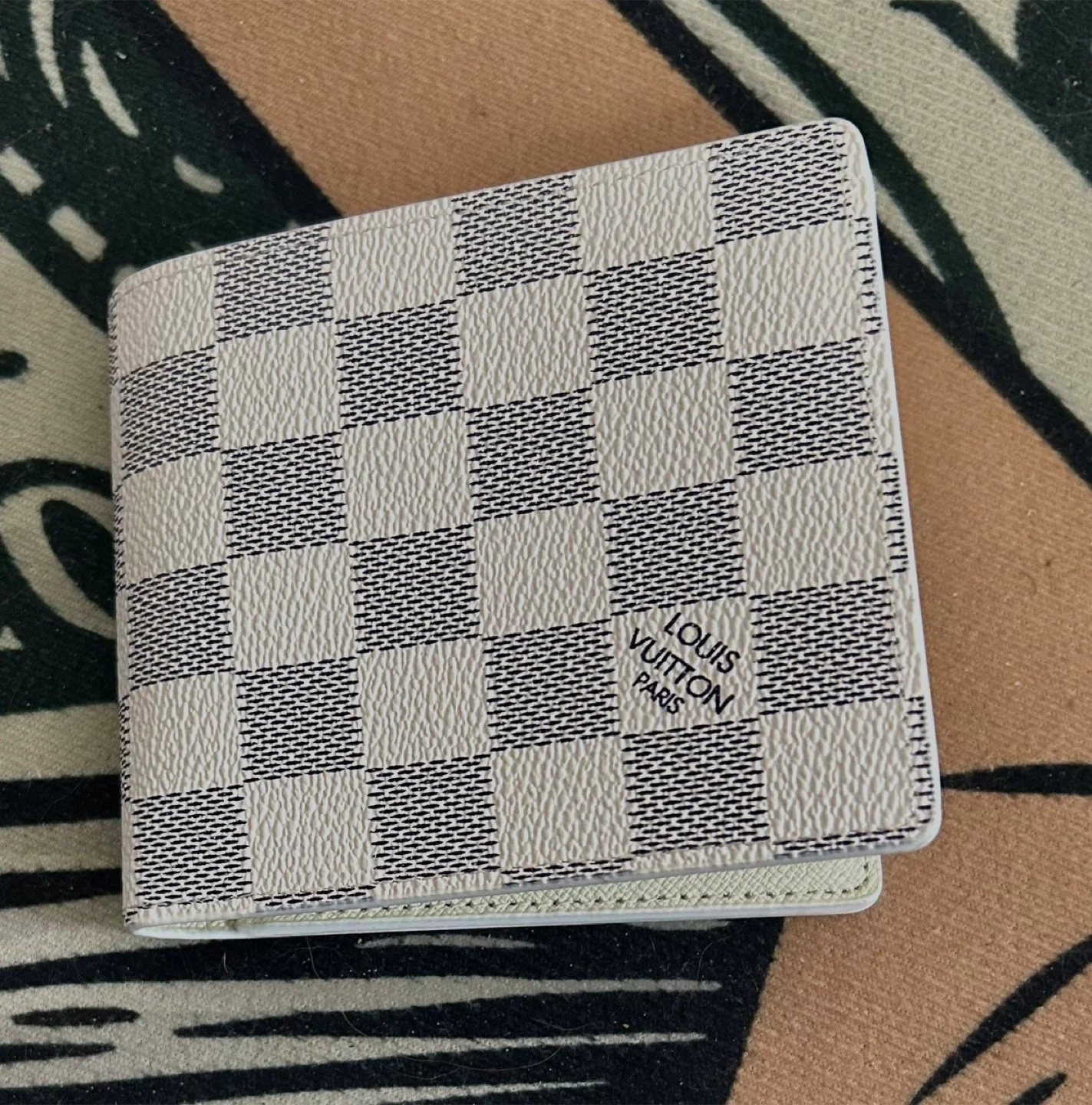 This Louis Vuitton wallet is made with the iconic Damier Azur canvas. It's a classic bifold design, perfect for keeping your cards and cash organized. The canvas is durable and stylish.
